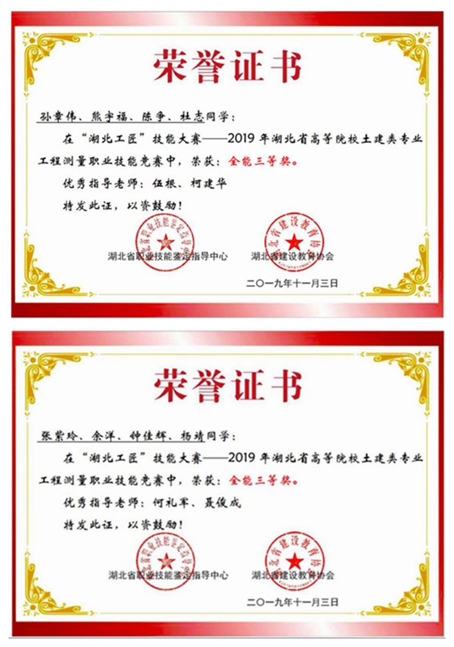 11月27日,湖北省建设教育协会公布了2019 年“湖北工匠”技能大赛——湖北省高等院校土建类专业工程测量职业技能竞赛获奖名单,我院派出的两支参赛队均获得全能三等奖。