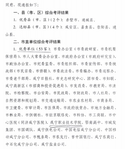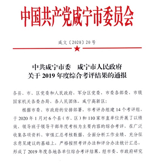 近日,咸宁市委、市政府发文通报2019年度综合考评结果,我校考核等次为“优秀”。