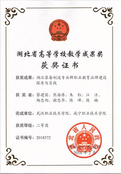 近日,我校收到第八届湖北省高等学校教学成果奖二等奖获奖证书,该成果是由我校和武汉职业技术学院联合参与完成的“湖北装备制造专业群职业教育品牌建设探索与实践”教学成果,于2018年2月在全省公布获奖。