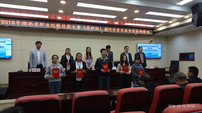 2018年湖北省职业院校技能大赛(高职组)“茶叶中重金属含量检测”赛项于10月14日在湖北生物科技职业学院顺利落幕。我校生物工程学院由推荐选手马晶和张慧霞、抽测选手何靖和李佳四位同学组成的参赛队,经过激烈角逐,荣获个人一等奖3项,个人三等奖1项的优异成绩,刘秀娟老师、孙连连老师荣获优秀指导老师奖。