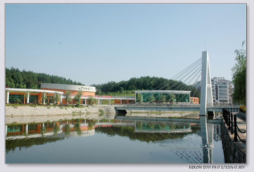 青山染黛,碧水澄明,琴桥迎风,柳堤生烟。山依湖而立,“天公亦爱校园美,移来青山作画屏”,所以山是“玉屏山”;湖伴山而栖,“瀑布杉松常带雨,夕阳彩翠忽成岚”,山岚飞动,烟笼湖面,湖因之名曰“友岚湖”。湖光山色,令人心胸开阔,滋养着浩然之气,更兼有百步柳堤,凝香掬翠;跨度为52米的斜拉索桥,如古琴亭亭玉立,演奏着和谐校园的天籁之音。一湖、一桥、一山、一堤,构成了一幅优美的江南山水园林画卷。