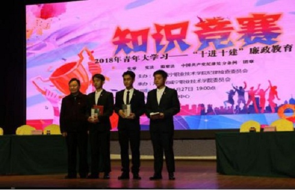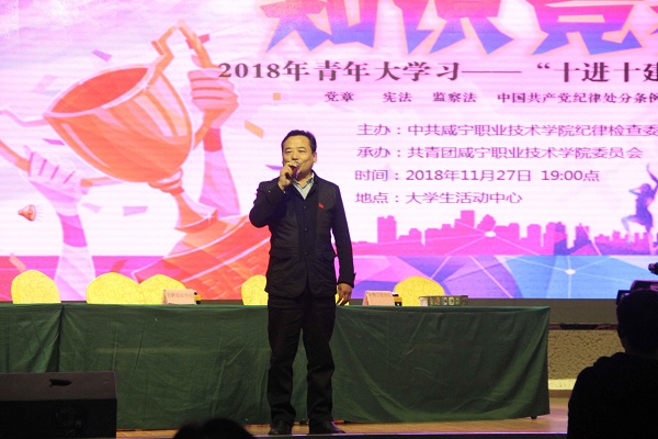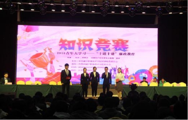 为深入贯彻落实党的十九大精神,加大全面从严治党、从严治团宣传教育工作力度,推进党章党规党纪和宪法、监察法深入青年学生和团学组织,由校纪检监察室、校团委主办的“十进十建”廉政教育知识竞赛于11月27日晚在大学生活动中心正式举行。校党委书记王继成、校长高焕清、纪委书记余为民、副校长周明生出席,各党总支书记、直属支部书记、各院部团总支书记以及300多名学生代表观看了比赛。