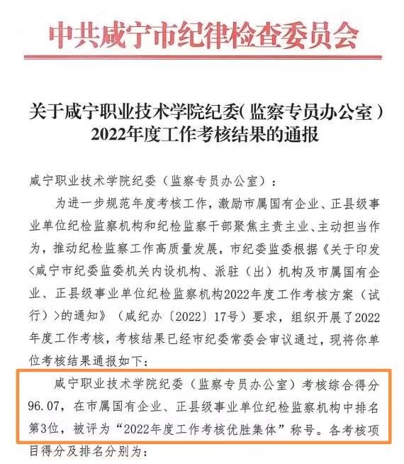 近日,从中共咸宁市纪委获悉,我校纪委、监察专员办公室被评为“2022年度工作考核优胜集体”称号。这是我校连续第2年获此荣誉。校主要领导批示,予以全校通报表彰,再接再厉。