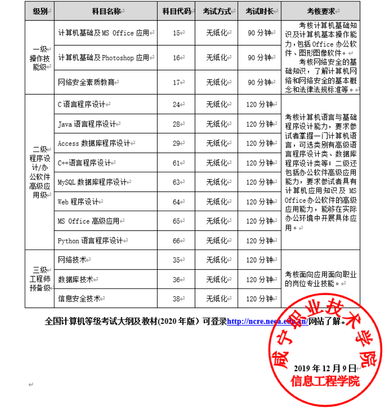 全国计算机等级考试(National Computer Rank Examination,简称NCRE),由教育部考试中心主办,面向社会,用于考查应试人员计算机应用知识与技能的全国性计算机水平考试体系,也是我院各专业人才培养方案中规定的必考项目。为做好本次报名工作,现将有关事项通知如下: