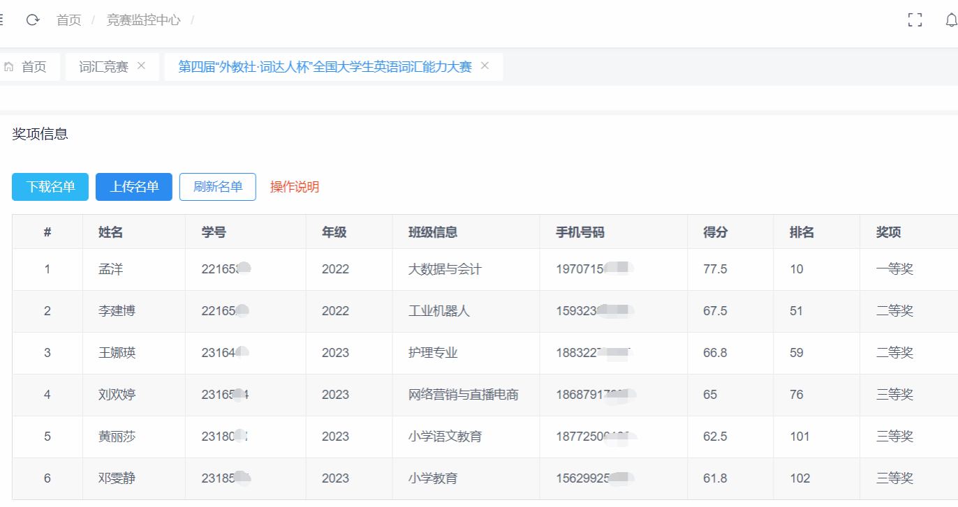 5月26日,第四届“外教社•词达人杯”全国大学生英语词汇能力大赛在线上圆满落幕。本次大赛由中国外语教材与教法研究中心和上海外语教育出版社联合主办,77779193永利官网承办。经过激烈角逐,我校孟洋同学荣获高职组省赛一等奖,李建博和王娜瑛同学荣获省赛二等奖,刘欢婷、黄丽莎、邓雯静荣获省赛三等奖的好成绩!