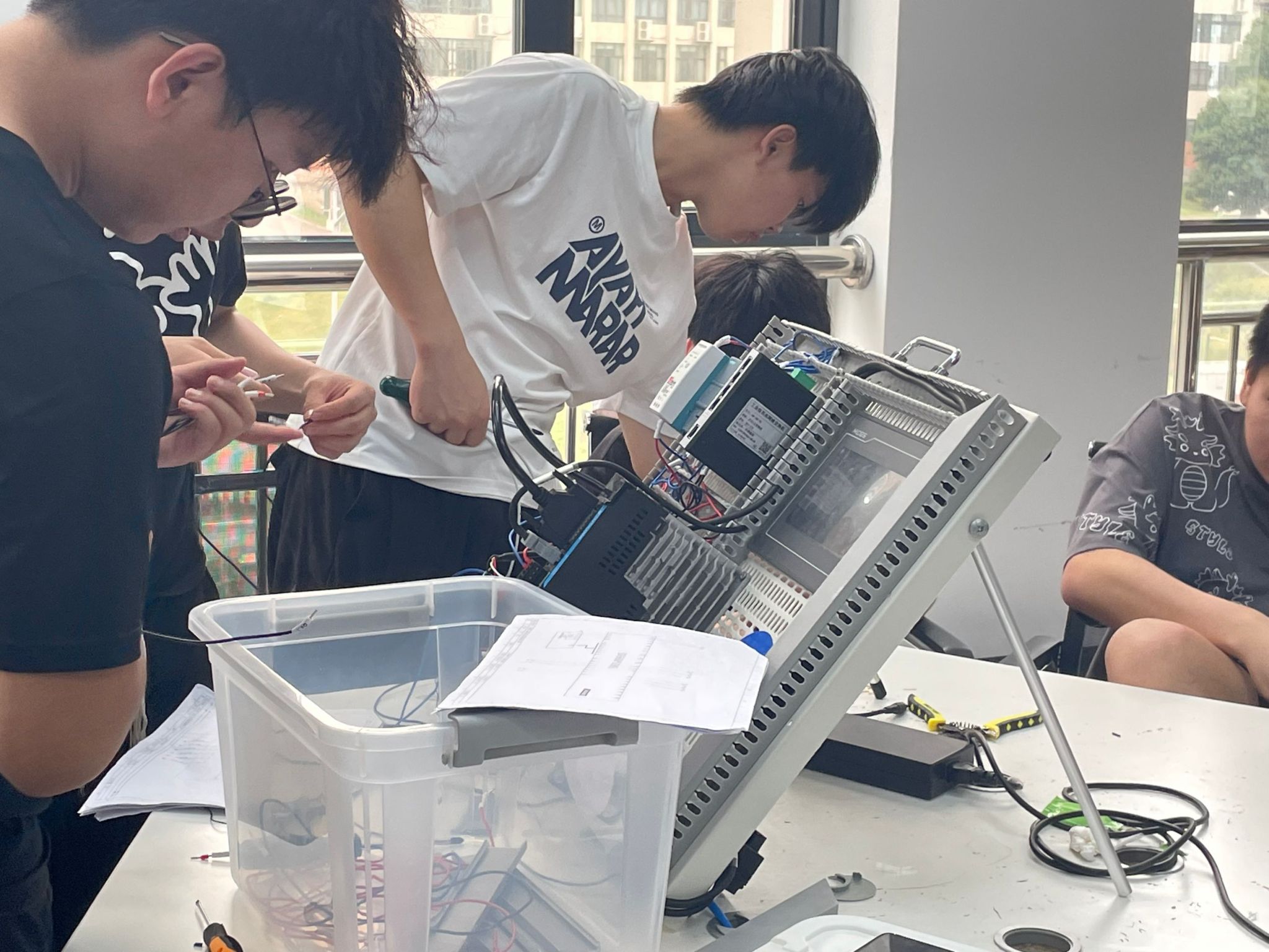 本次课程主要以可编程控制器电气装调竞赛的形式开展,现场工程师班合作方“咚咚校园”提供了教学竞赛需要的设备,让大家能真实模拟企业真实的工程项目。通过一整天可编程控制器电气装调课程的培训及竞赛,同学们认真学习、细致讨论,并最终进行了小组内部剪线、装线和安装设备等流程的分工。经过各小组团队协作,均圆满完成了竞赛任务,部分小组在熟练掌握了操作要点后还主动挑战了最短时间完成PLC操作系统的组装及接线。