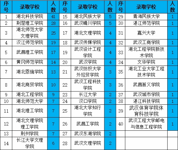 星光不负赶路人,天道酬勤佳音来,近期,随着2024年湖北省普通高等教育专升本考试成绩公布,人文艺术学院目前有267名学生被湖北师范大学、湖北科技学院、长江大学、荆楚理工学院等40所本科院校录取,录取人数及比例创历史新高,其中2人因国赛获奖被汉江师范学院免试录取,137人升入公办本科院校。