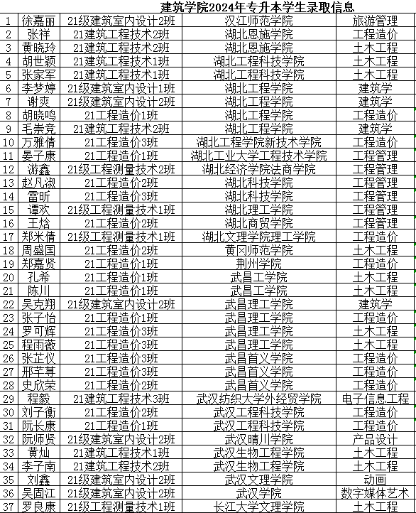 金榜题名,筑梦前行。2024年湖北省专升本考试录取工作圆满结束,建筑学院2024届毕业生在此次考试中拾级而上、锐意进取,37名同学以优异的成绩成功被湖北工程学院、湖北科技学院、黄冈师范学院等优质本科院校录取,开启新的人生征程。