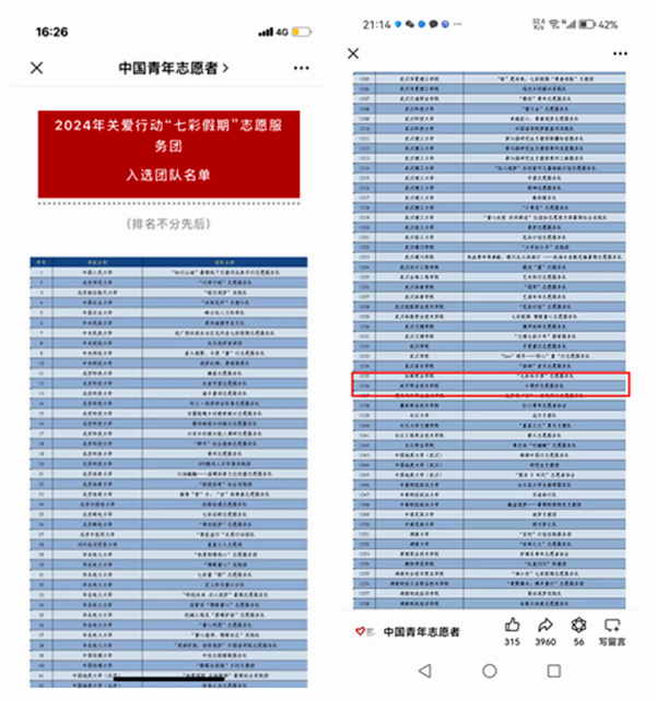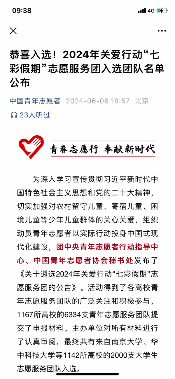近日,团中央青年志愿者行动指导中心、中国青年志愿者协会秘书处公布了2024年关爱行动“七彩假期”志愿服务团入选团队名单,其中我校建筑学院小青柠志愿服务队顺利入选。