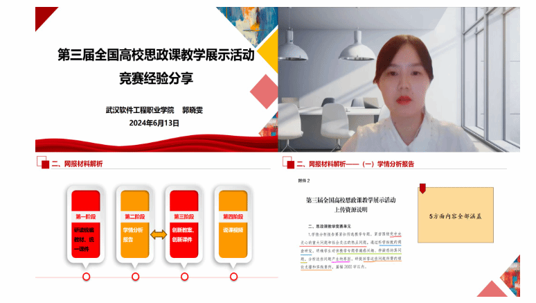 在培训中,郭晓雯老师从赛事流程分析、网报材料解析、现场展示解析、教师备赛建议、教师疑问解答等六个方面,结合自己参加第三届全国高校思政课教学展示活动荣获“教学竞赛单元”一等奖的参赛经历,针对活动前搜集的教师问题进行竞赛培训指导。77779193永利官网思政课教师针对目前备赛中存在的其他问题进行现场提问并进行自由交流。