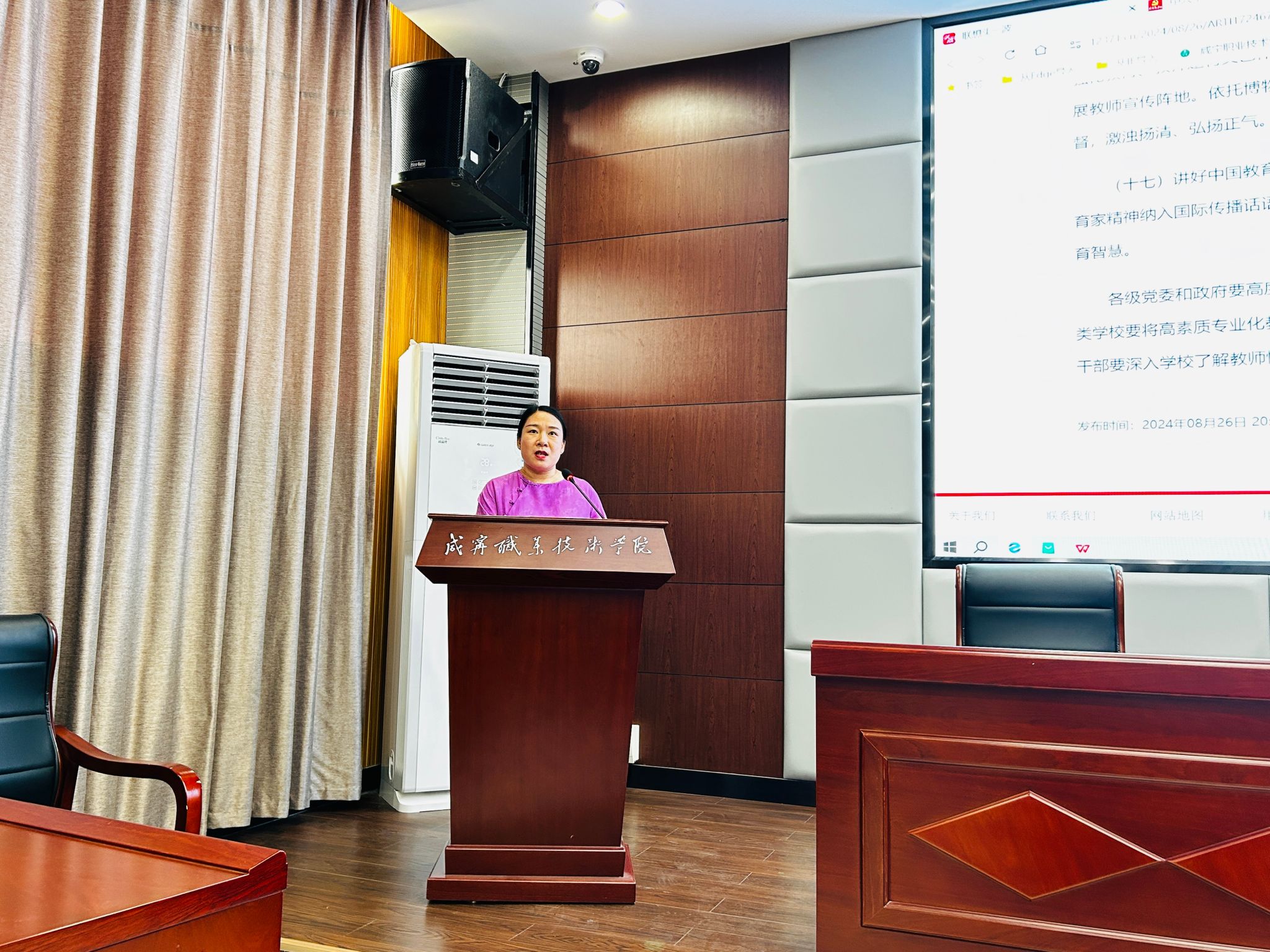 首先,袁苗苗传达学习党的二十届三中全会精神,领学《中共中央关于进一步全面深化改革 推进中国式现代化的决定》。副院长肖琼领学《中共中央 国务院关于弘扬教育家精神加强新时代高素质专业化教师队伍建设的意见》(以下简称《意见》)。随后,今年十佳师德标兵余娟和十佳辅导员代表汪淑娴分别讲述她们获奖的事迹,新进教师代表黄温馨分享学习心得。