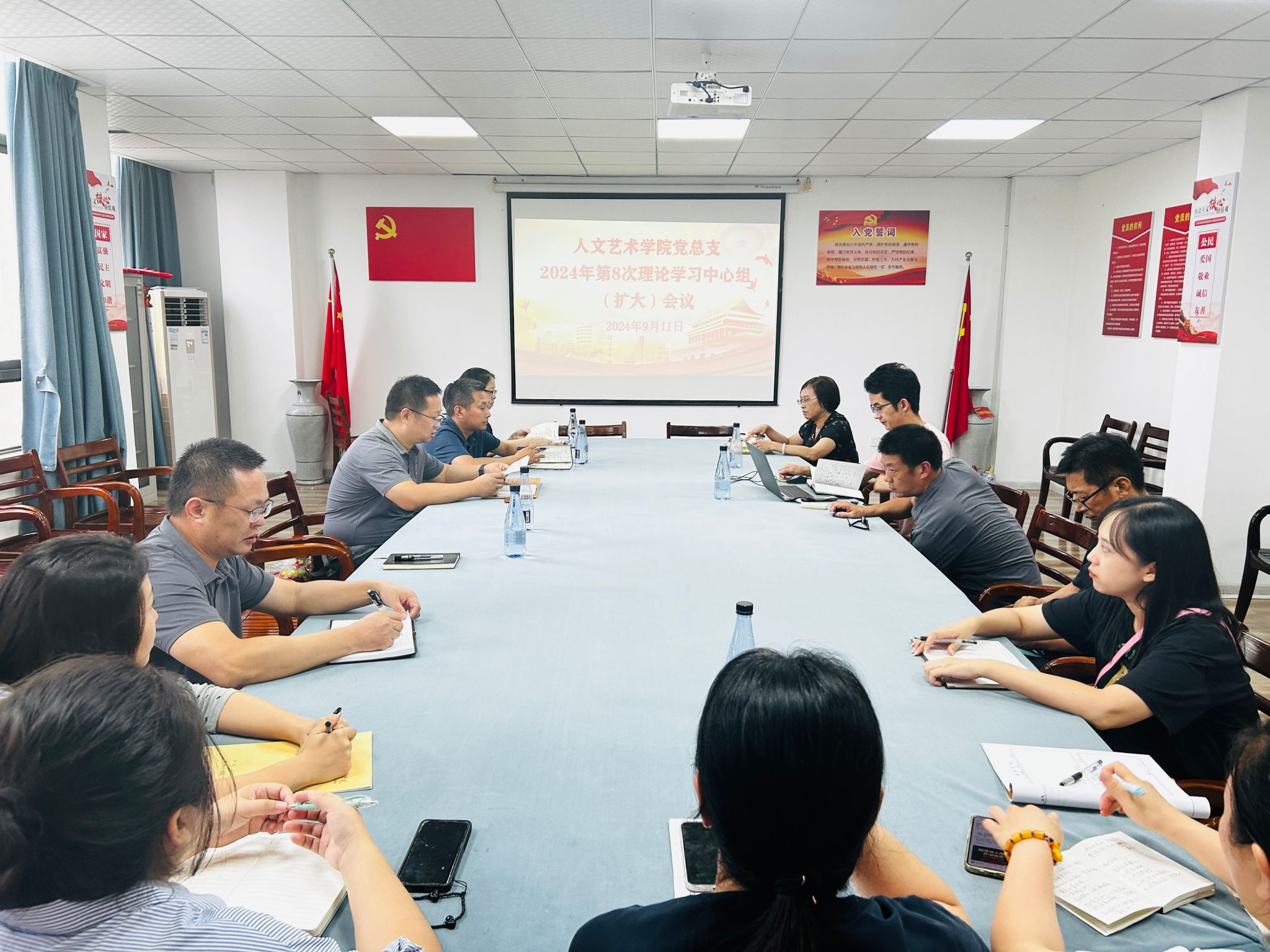 9月11日下午,人文艺术学院党总支在教育实训中心7楼会议室召开理论学习中心组(扩大)集体学习会,会议由学院党总支书记韩飞主持。
