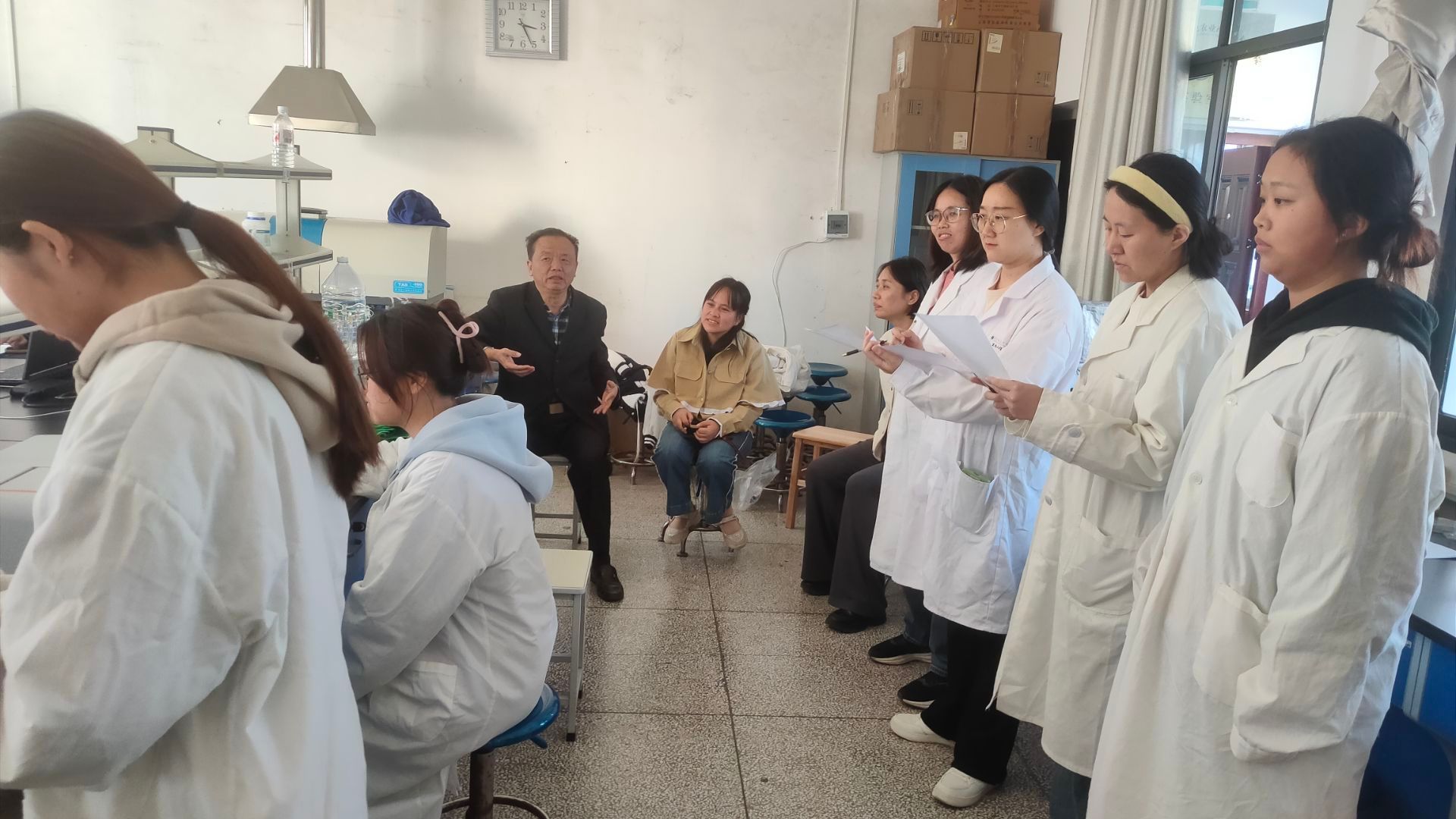 首先,一行人到生物楼202观摩了食品安全与质量检测赛项,项目主题为“果蔬中亚硝酸盐含量的测定”。该项目主要考核学生对照“GB5009.33-2016”国家标准,运用紫外分光光度法完成黄瓜中亚硝酸盐含量的测定。竞赛过程中,学生完成了黄瓜样品预处理、硝酸盐标准曲线工作液的配制、新紫外仪的使用及数据处理等任务。学生整体技能操作较规范、且具备较高的解决问题的能力。