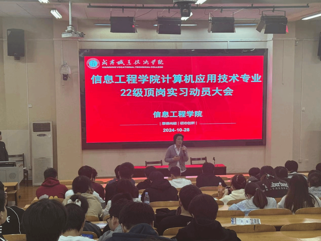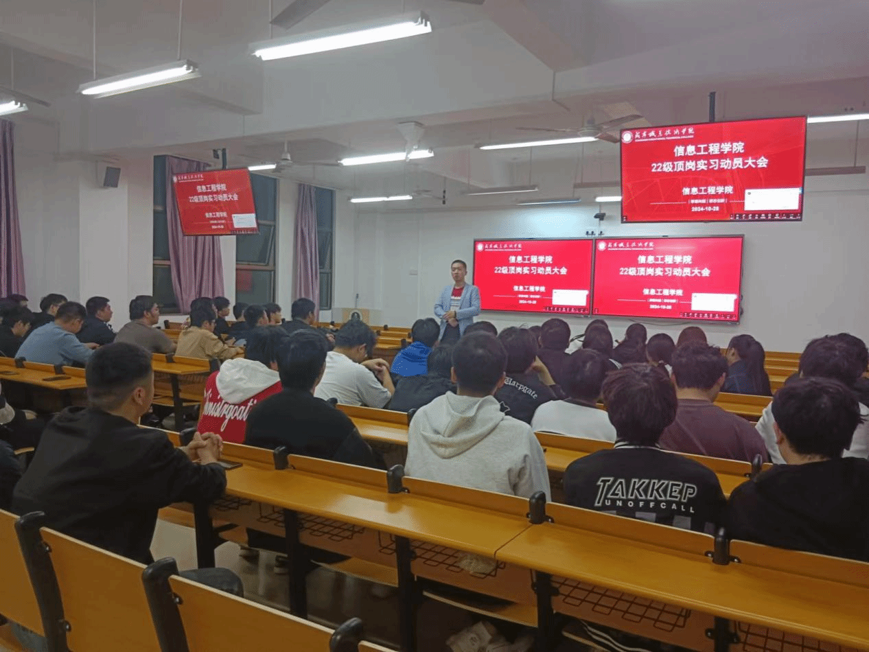 动员会介绍了信息工程学院2022级学生顶岗实习工作的整体安排,对实习工作管理、安全管理、请假制度、住宿管理、实习平台填报等方面进行了详细培训,解答了同学们对于实习工作中的各种疑惑。最后要求同学们按照学校顶岗实习安排,在保证安全前提下敢于表现,敢于拼搏,在实习中学习技能、锻炼品质、积累经验,为毕业后的就业打下坚实基础。