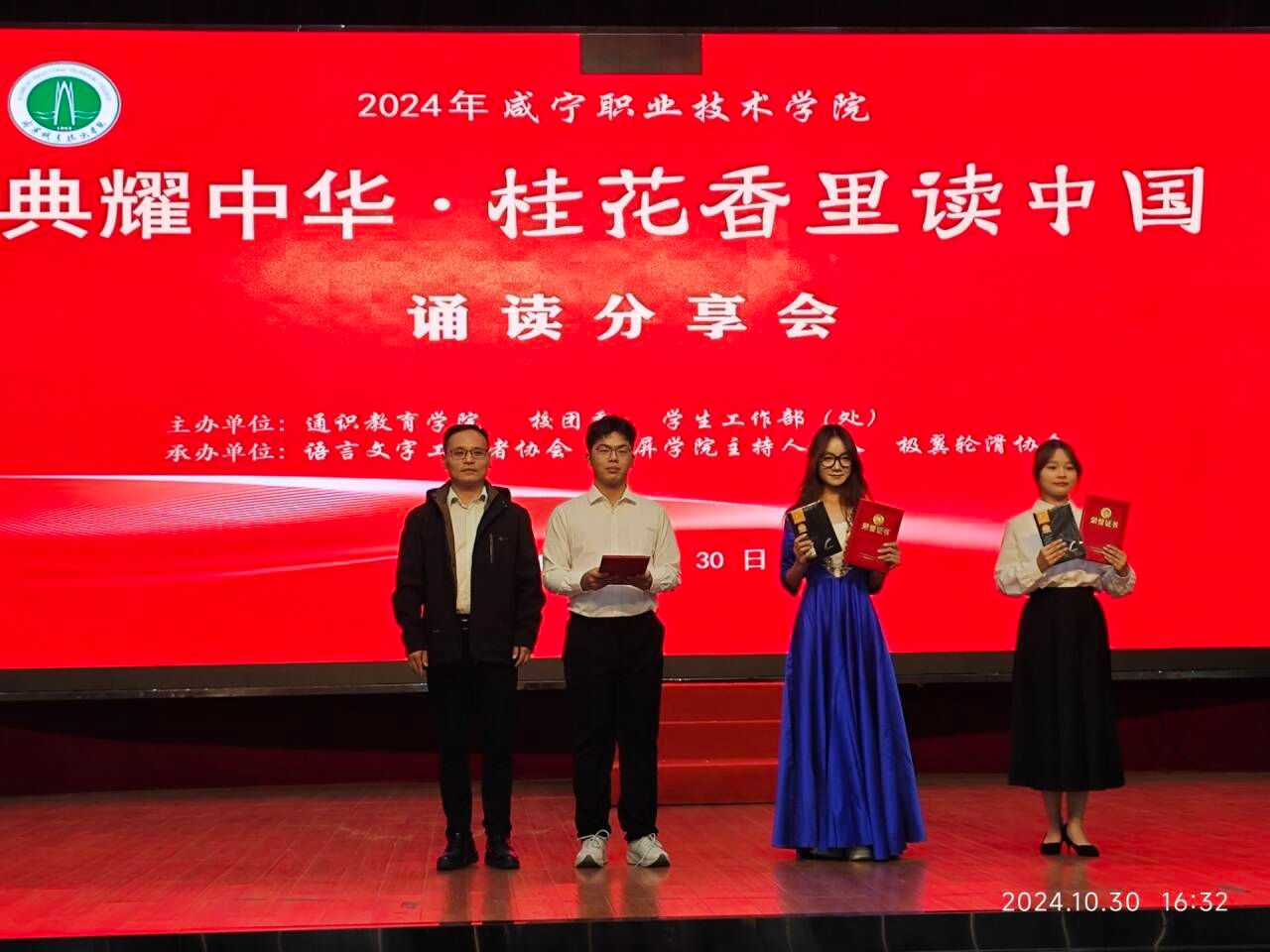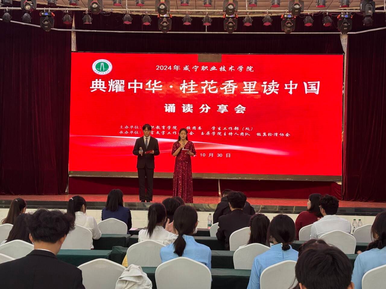近日,由通识教育学院、校团委、学工部(处)共同主办,学校语言文字工作者协会、玉屏学院主持人工作部、极翼轮滑协会联合承办的“典耀中华之桂花香里读中国”诵读分享会在大学生活动中心开展。学校教师代表和各学院学生代表参加活动。
