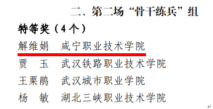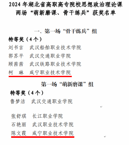根据《2024 年度全国高职高专院校思想政治理论课“萌新磨课、骨干练兵”活动实施方案》和《关于举办全国高职高专院校思想政治理论课 2024 年度“萌新磨课、骨干练兵”的通知》等文件精神,湖北省高职高专院校思想政治理论课建设联盟举办了两场比赛。经专家评审,在第一场“萌新磨课、骨干练兵”比赛中,我校柯琳老师获“骨干练兵”组特等奖,陈文霞老师获“萌新磨课”组特等奖。在第二场“萌新磨课、骨干练兵”比赛中,我校解维娟老师获“骨干练兵”组特等奖。