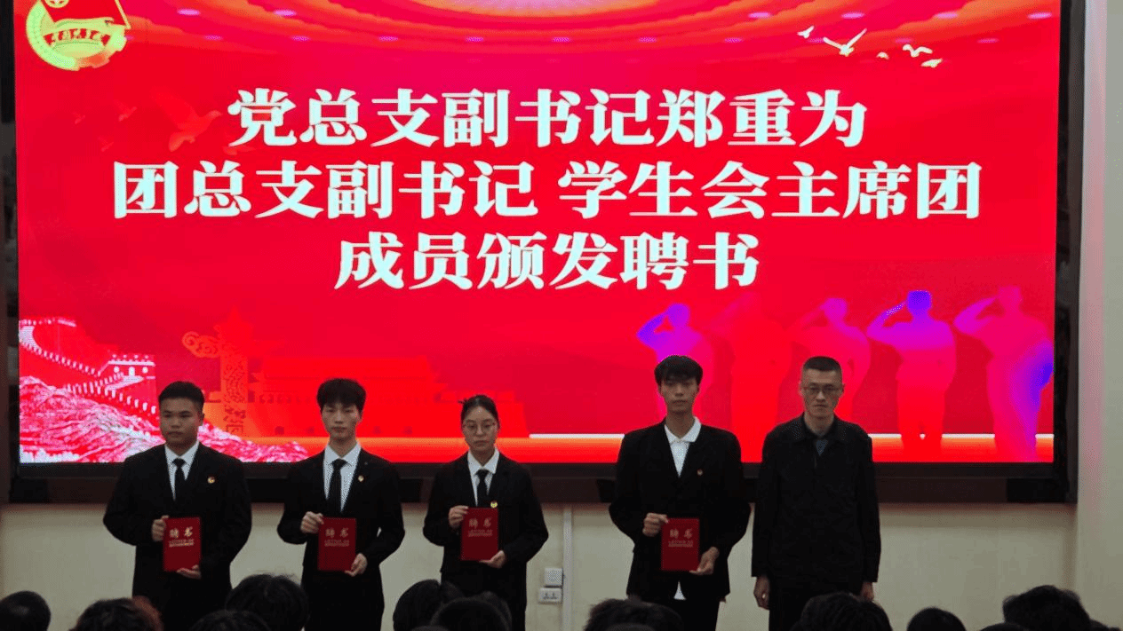 随后,与会领导和老师为新一届团总支、学生会学生干部颁发了聘书。全体学生干部在团旗下重温入团誓词,铿锵有力的誓言表达了新一届学生干部以身作则,敢为人先的决心。
