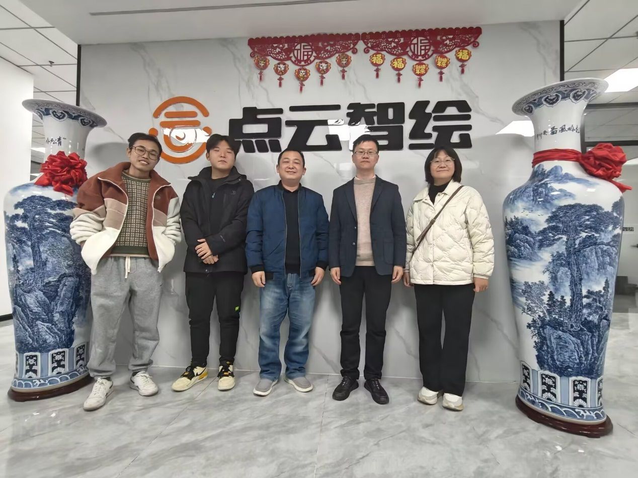 最后,老师们来到武汉点云智绘科技有限公司走访。双方开展深入交流,公司负责人吴镇山介绍了业务领域、技术创新、员工培养等方面的情况,伍根介绍了学院专业群建设和项目式教学实践情况。双方就建筑测绘技术的最新动态、应用场景及未来发展方向进行了热烈讨论,并就学生岗位实习和实践教学等合作事宜达成共识。
