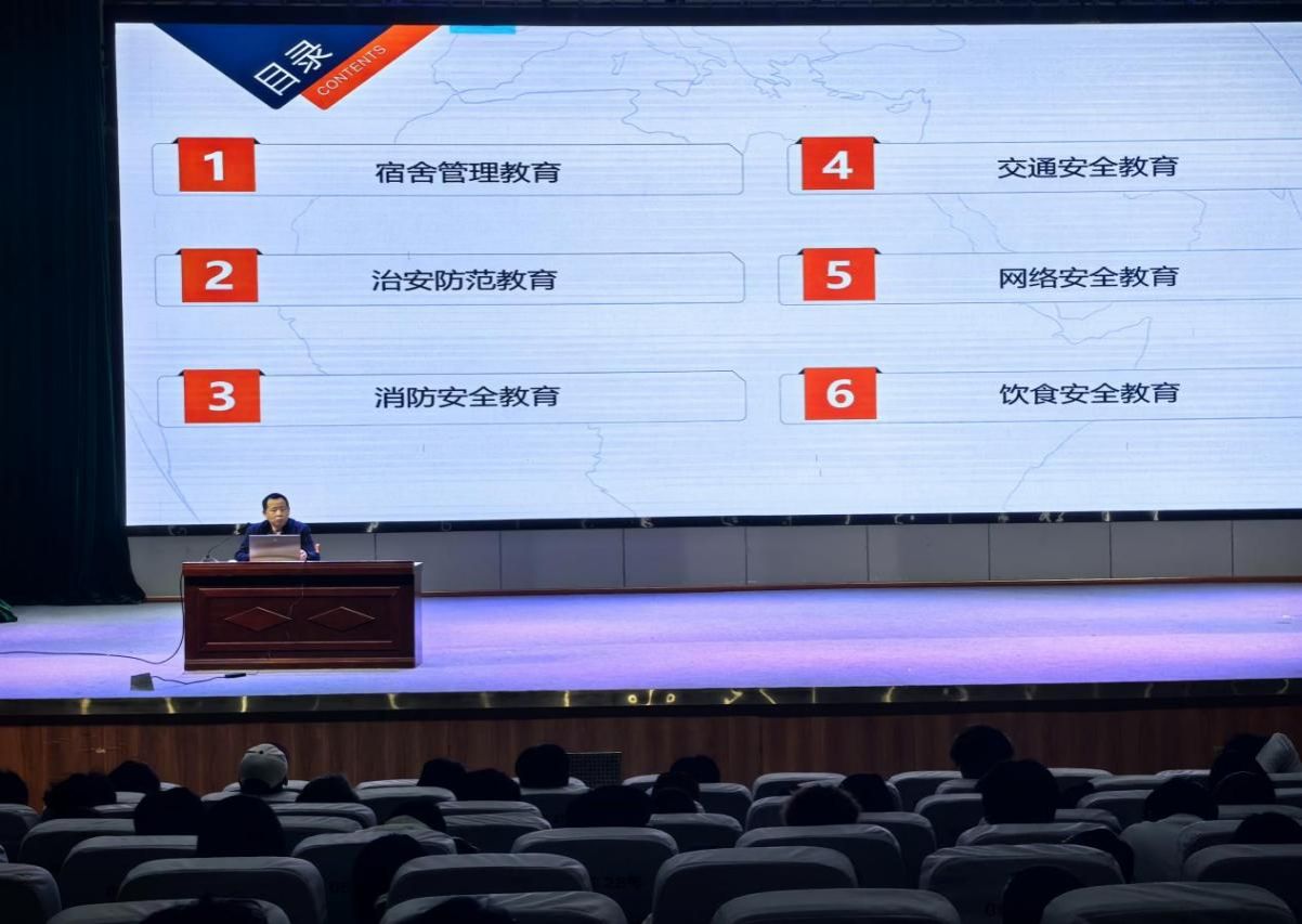 吴勇从宿舍管理、治安防范、消防安全、交通安全、网络安全、饮食安全六个方面展开讲授:从“宿舍管理教育”规范用电、卫生等生活细节,到“治安防范教育”剖析校园盗窃、诈骗案例;从“消防安全教育”传授火灾应急技巧,到“交通安全教育”“网络安全教育”“饮食安全教育”等实用技能,通过理论结合实例的讲解,将安全知识深入浅出地传递给学生。