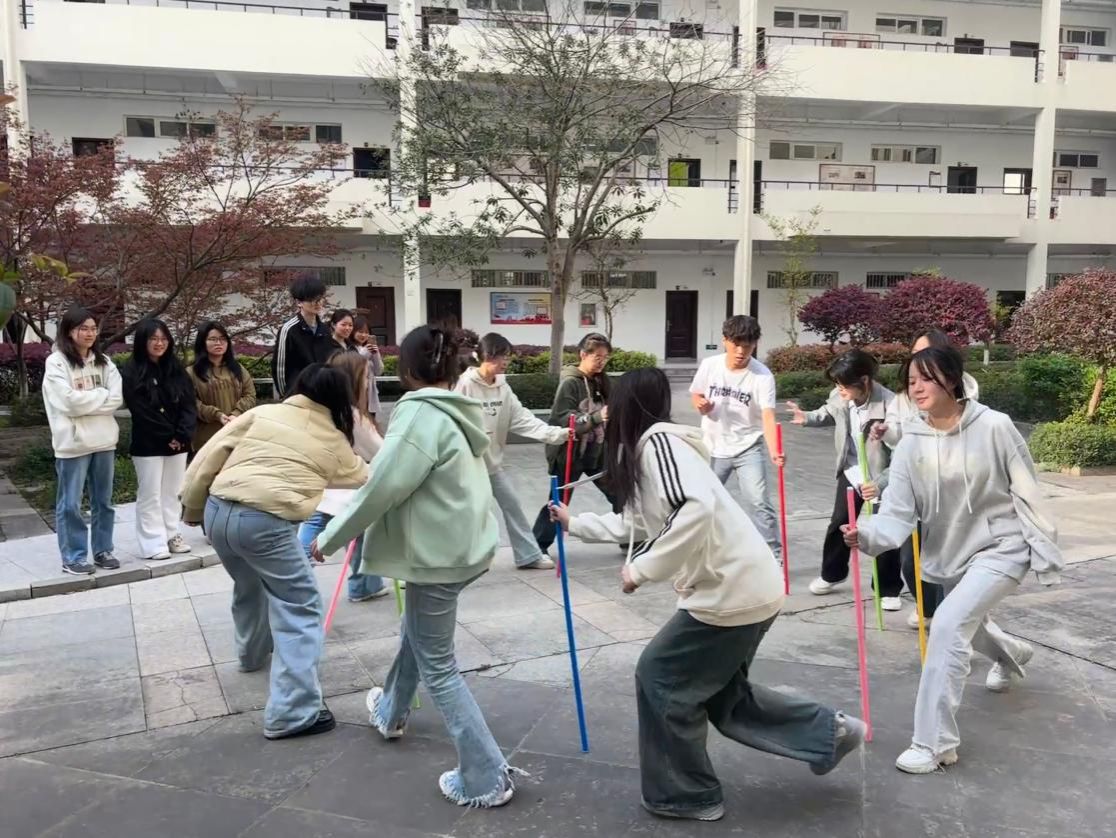 在绿意盎然的文华楼广场上,“不倒森林”游戏以别开生面的形式展开。参与者需通过默契配合,在移动过程中保持长杆不倒,看似简单的规则实则考验团队协作与心理素质。党员骨干率先示范,引导同学们在失败中总结经验,在成功中深化信任。随着游戏推进,欢笑声与加油声此起彼伏,原本拘谨的同学逐渐敞开心扉。“当所有人专注同一目标时,我感受到集体力量的强大!”参与者刘同学感慨道。这种寓教于乐的互动,不仅缓解了学业压力,更让团结协作的种子在潜移默化中生根发芽。