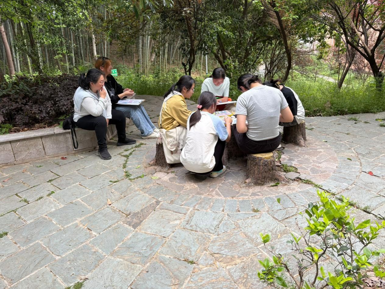 在空地中央,学生们围坐在一起,自由创作。有的同学用深蓝与灰色描绘压力,同时用明黄点缀希望。朱玲老师解释道:“绘画是一种无声的语言,能帮助同学们正视自己的情绪。我们鼓励大家将焦虑‘画出来’,并通过交流将其转化为积极的力量。”
