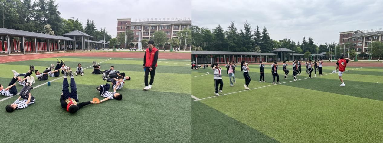 活动在动感十足的热身操中拉开序幕,师生们伴着音乐节奏舒展筋骨,通过头部绕环、肩部拉伸、弓步压腿等动作,有效提高了关节活动度。一套动作下来,迅速拉近了师生距离。热身结束,学生们被分为四个小组,分别由四名志愿者担任“小老师”,带领各小组有序开展专项训练。随后,小老师们依托自身专业特长,依次开展了“有氧操体能提升”“速度与敏捷闯关”“耐力挑战赛”“趣味力量训练”等特色项目。再通过镜面示范讲解踏步、侧并步等基础动作,配合"123木头人"游戏强化动作记忆;继而加入波比跳与开合跳组合训练,学生们在欢声笑语中掌握运动技巧,在汗水中尽情释放活力。“老师们的动作超酷!我学会了用正确姿势跑步,还得第一名!”一名参与活动的学生兴奋地说道,操场上洋溢着蓬勃朝气。
