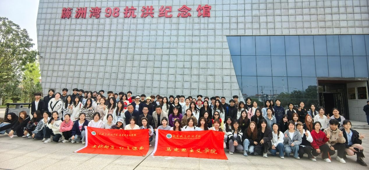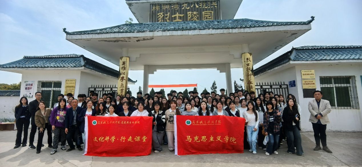 紧接着,师生们怀着崇敬之情来到嘉鱼县簰洲湾镇的九八抗洪烈士陵园。此地庄严肃穆,承载着 1998 年特大洪灾中,空军高炮某团 225 营及广州军区某舟桥旅 5 营官兵们英勇抗洪、舍生忘死的伟大壮举,连指导员高建成等 19 位烈士在此献出宝贵生命。在陵园内,马克思主义学院常卫峰老师以生动且饱含深情的话语,开展了一堂别开生面的微党课,深度剖析九八抗洪背后展现的坚韧不拔、无私奉献的伟大精神,带领学生们回溯党的光辉奋斗历程,让红色基因的内涵深深扎根在学生心中。随后,全体人员整齐列队,向抗洪英雄纪念碑敬献花篮,在默哀中寄托对烈士的无尽哀思,现场氛围凝重而庄严,学生们深刻体会到和平与安定的来之不易,纷纷表示要铭记历史、传承精神,勇担时代赋予的使命。