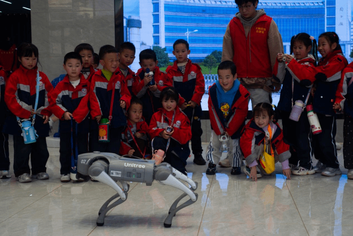 在互动环节中,小朋友们分组操作,在社团成员和专业老师指导下,发挥创造力和实践操作能力,与机器狗欢乐互动。现场气氛热烈,欢笑声不断。