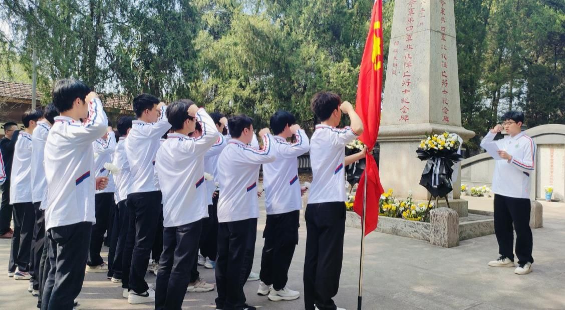 接下来是重温入团誓词环节,学生代表孙文轩带领全体成员重温入团誓词。铮铮誓言回荡在陵园上空,彰显了青年一代继承革命传统、奋发有为的坚强决心。随后,全体成员依次向烈士纪念碑敬献鲜花,表达对革命先烈们的缅怀和敬仰之情。