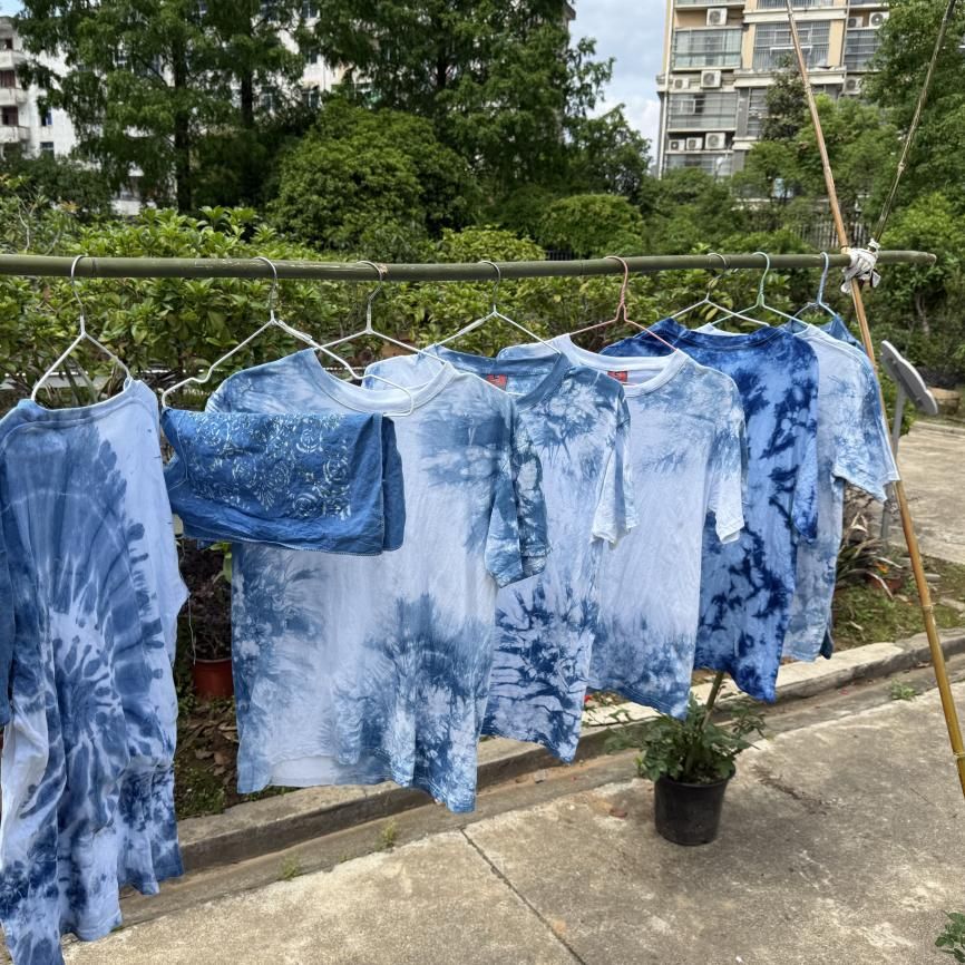 实践创作阶段,学生们严格遵循“设计—扎结—染色—氧化”工艺流程,在素白织物上演绎非遗技艺的现代转化。当百余件扎染作品悬挂晾晒时,冰裂纹、鱼子缬等传统纹样与学生们的创意交织共生,形成“千扎万染不易成,一池深浅见匠心”的生动图景。
