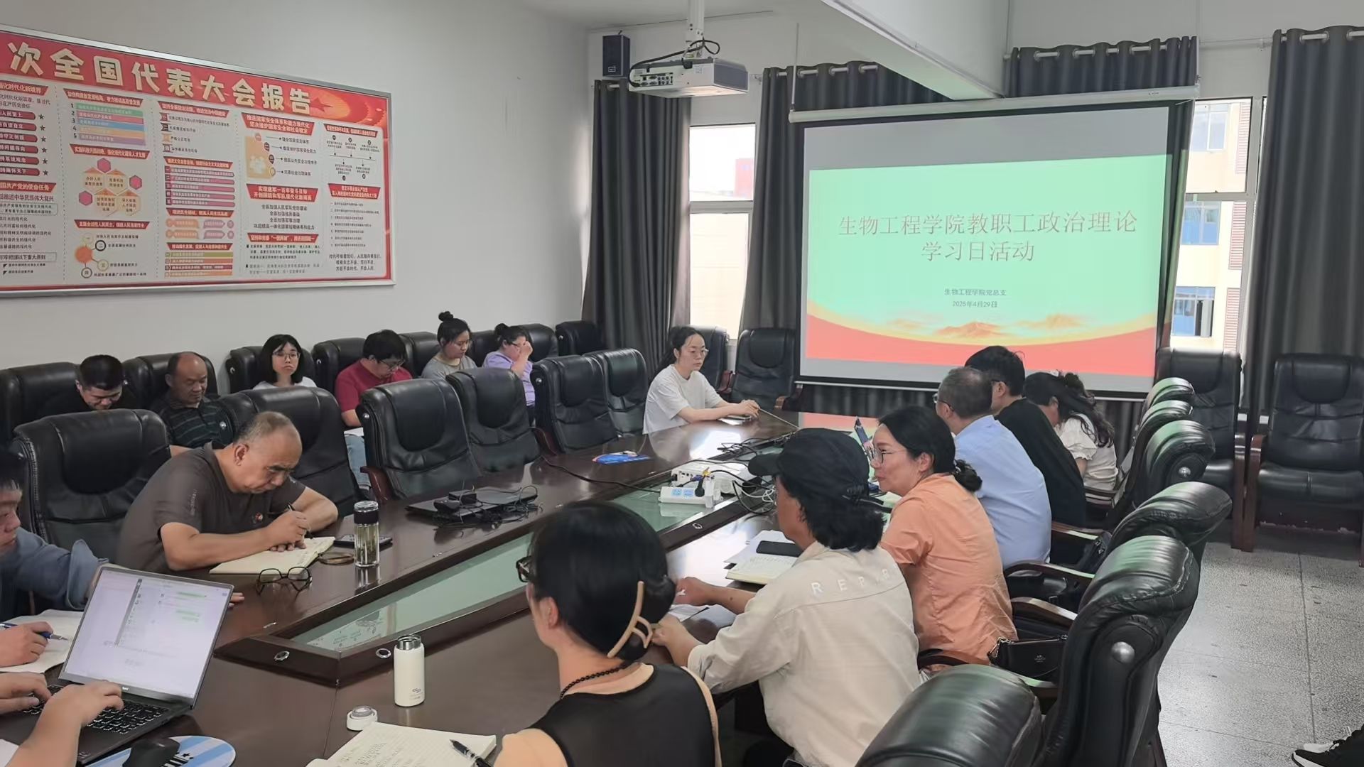 4月29日,生物工程学院按照校党委统一部署,在生物楼四楼会议室组织召开4月政治理论学习。学院全体教职工参加会议,会议由党总支书记王宗莉主持。会议围绕深入学习贯彻《2025年中央一号文件》精神,结合学院学科特色与专业优势,就如何服务国家乡村振兴战略、推动农业现代化展开专题学习与研讨。