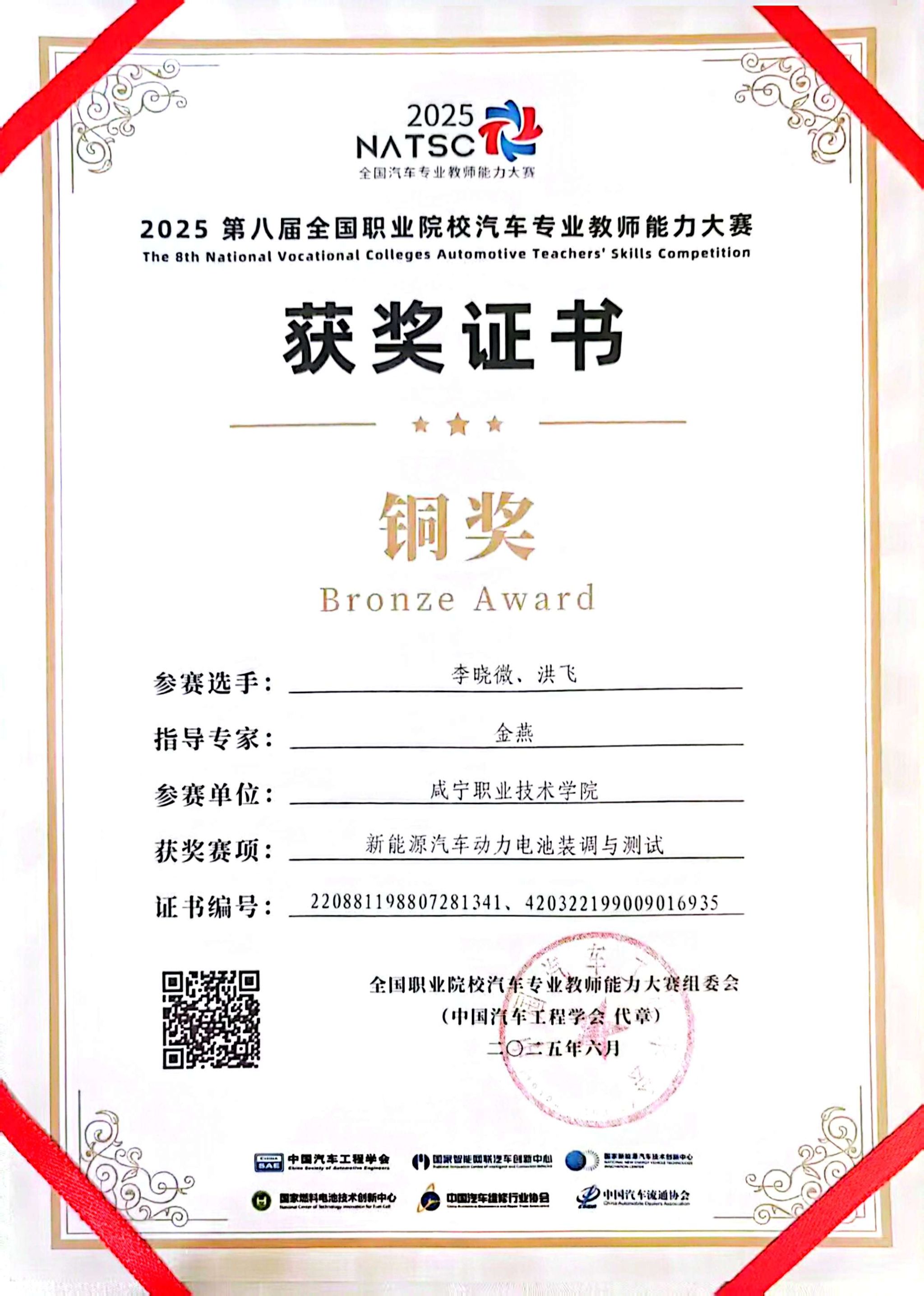 6月16日,第八届全国职业院校汽车专业教师能力大赛在荆州职业技术学院闭幕。我校新能源汽车教学团队洪飞、李晓微教师凭借扎实的专业功底与出色的现场表现,在众多选手中脱颖而出,荣获铜奖。