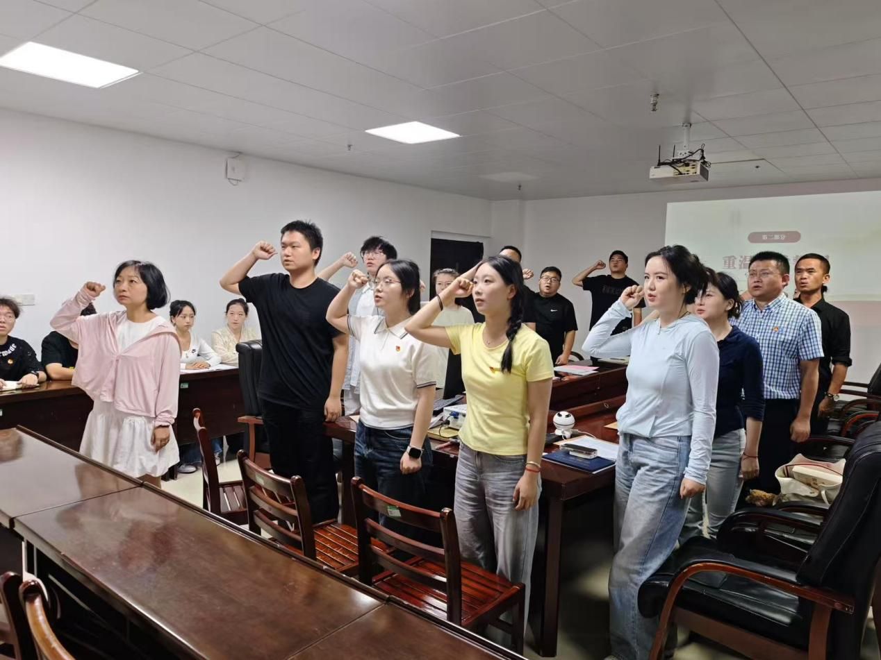 活动初始,全体人员起立齐唱国歌;随后全体党员同志重温入党誓词;会上,毕业生党员代表陈柔以《从灯塔到新征程》为主题深情发言,结合自身经历,感恩党组织在学业、思想成长中给予的引领与滋养,号召大家始终不忘初心、牢记使命,将个人理想融入国家发展大局,持续学习,提升政治素养,积极投身到未来的生活与工作中去。