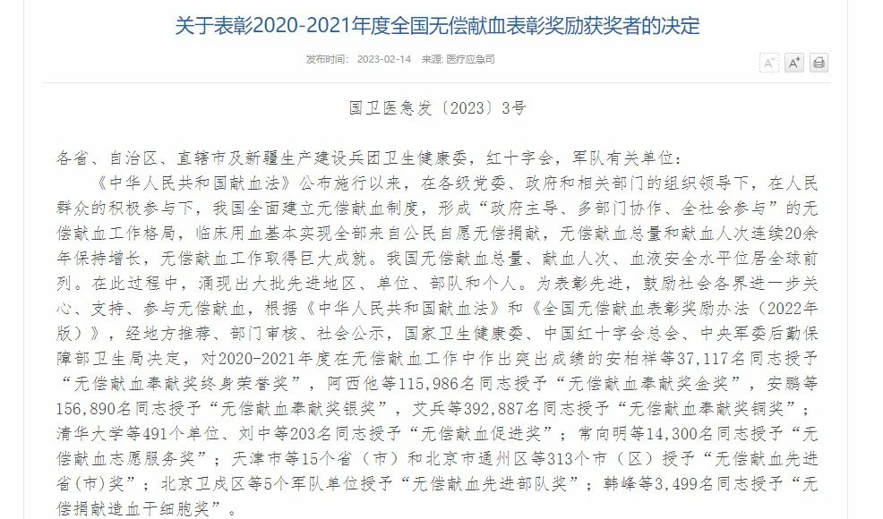 近日,国家卫健委公布了《关于表彰2020-2021年度全国无偿献血表彰奖励获奖者的决定》。我校喜获2020-2021年度“全国无偿献血促进奖”荣誉称号,成为湖北省获此殊荣的12个单位之一。