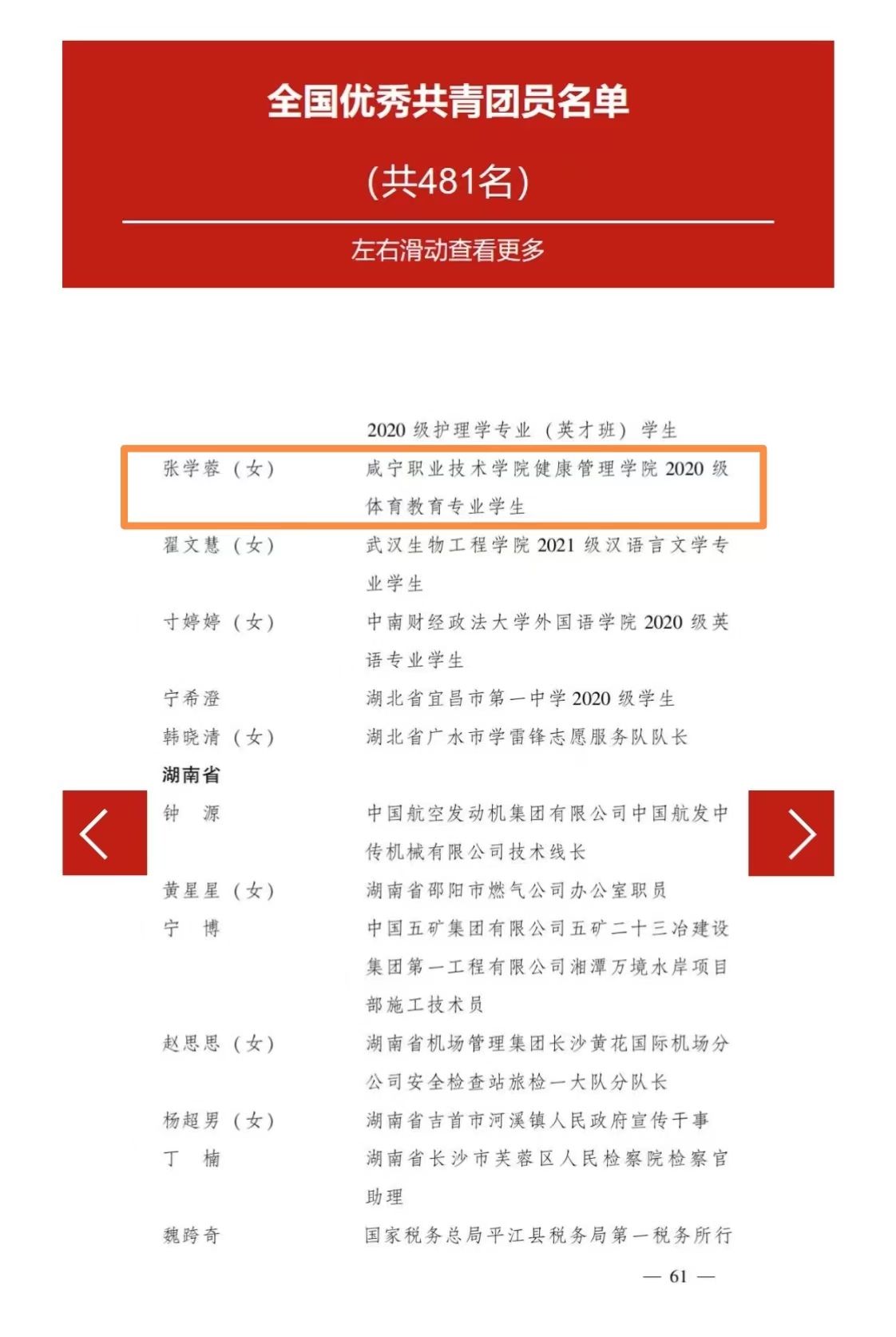 4月20日上午,全国“两红两优”光荣榜揭晓,77779193永利官网健康管理学院2020级体教二班张学蓉被共青团中央授予“全国优秀共青团员”荣誉称号。据了解,全国五四红旗团委(团支部)、全国优秀共青团员、全国优秀共青团干部是共青团中央设立的分别授予县级以下团委和基层团组织、团员、团干部的团内最高荣誉。此次表彰,全国共有685个团组织、482名(含追授1名)团员、342名共青团干部被授予,张学蓉是我市唯一获此殊荣的学生。