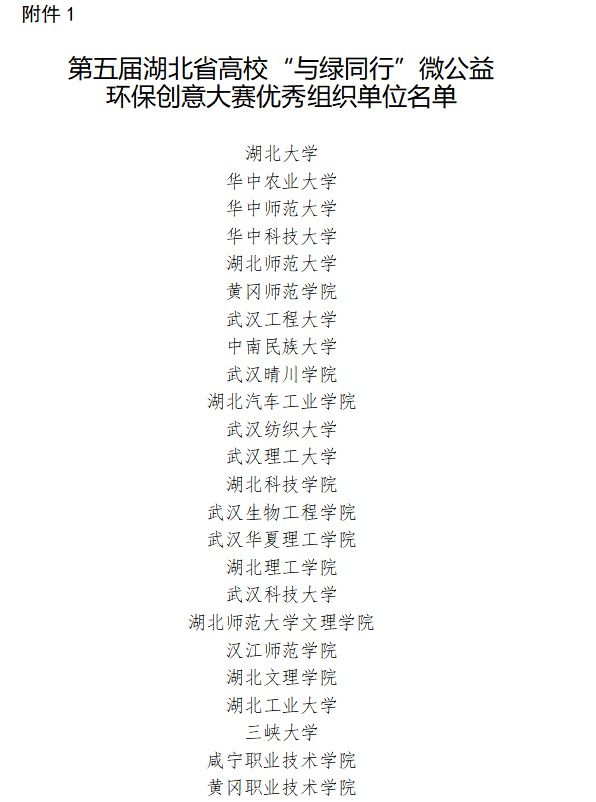 近日,从湖北省生态环境厅获悉,我校被评为第五届湖北省高校“与绿同行”微公益环保创意大赛优秀组织单位。