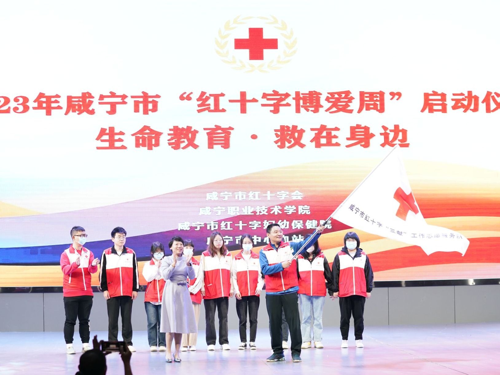 何琼珍为咸宁市红十字“三献”工作志愿服务队授旗,全贤发宣布咸宁市2023年“红十字博爱周”活动正式启动。