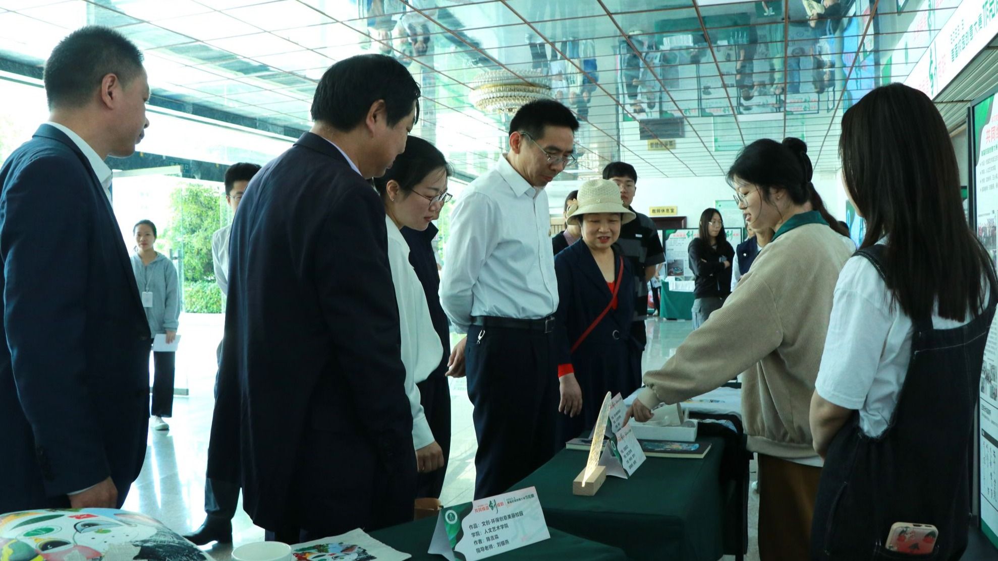 为深入学习宣传贯彻党的二十大精神,落实立德树人根本任务,弘扬和传播我校校园文化,5月9日上午,以“学习党的二十大,共同缔造‘创’我校”为主题的首届校园创意大赛作品展在文华楼一楼开幕。校党委书记高焕清,党委副书记龚光松,共青团咸宁市委副书记李雪梅,党委委员、宣传部(统战部)长华先宙参加活动。