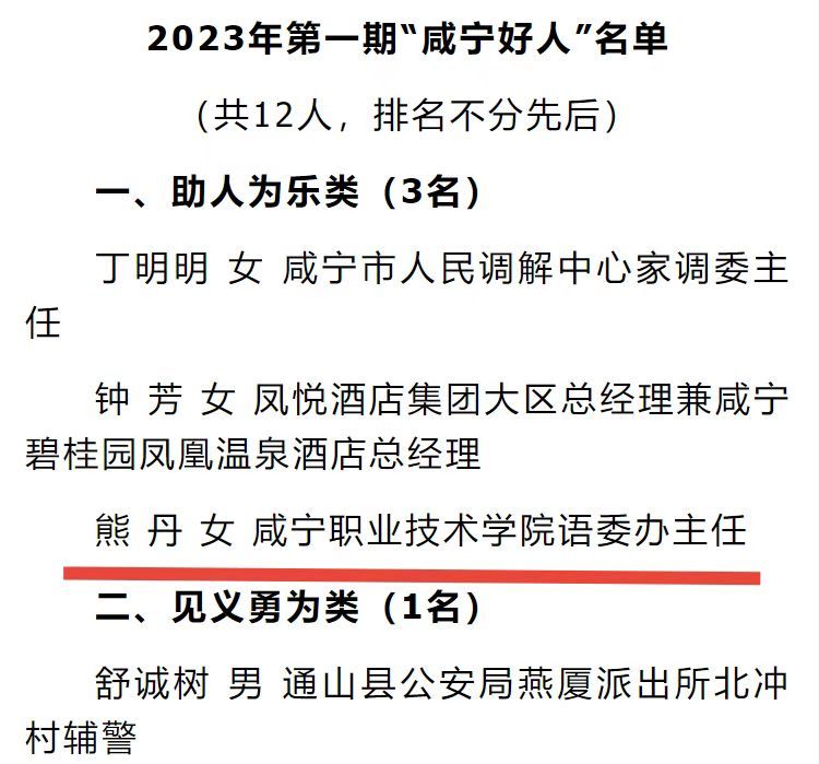 为深化全市群众性精神文明创建活动,市委文明办组织各县(市、区)委文明办、市直各单位广泛推荐2023年第一期“咸宁好人”候选人。经严格把关、认真评审、社会公示等程序,5月9日,市委文明委发布决定,授予丁明明等12人获评“咸宁好人”荣誉称号。我校教师、语委办主任熊丹上榜。