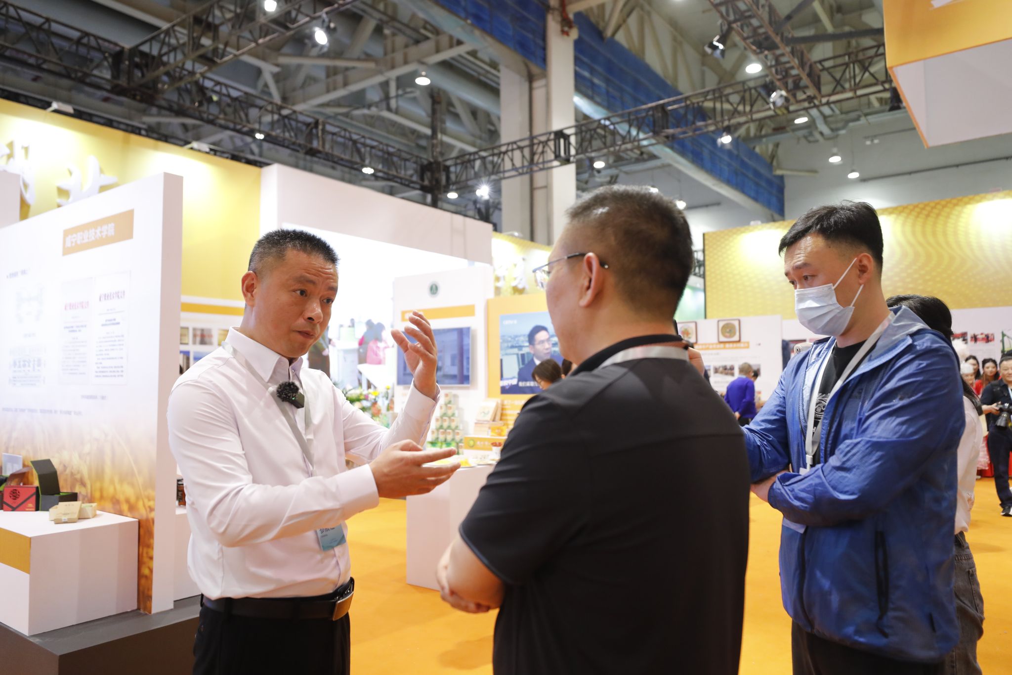 我校“乡村振兴”主题展区以独具湖北地方特色的砖茶系列、桂花系列、生姜系列、莲藕系列、黄袍农夫秘制酱系列产品,吸引了来自全国各地兄弟院校的中外师生驻足参观、体验和交流。