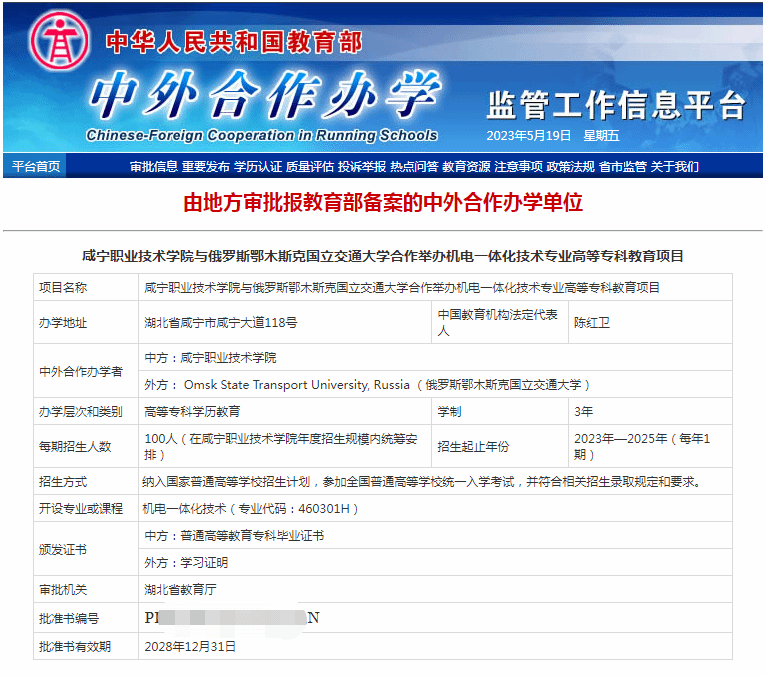 近日,我校与鄂木斯克国立交通大学合作举办机电一体化技术专业和软件技术专业高等专科教育项目,在教育部中外合作办学监管工作信息平台(https://www.crs.jsj.edu.cn/)发布,这是我校首次获批省教育厅审批、教育部备案的中外合作办学项目。
