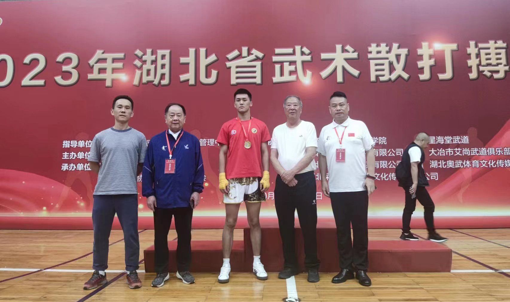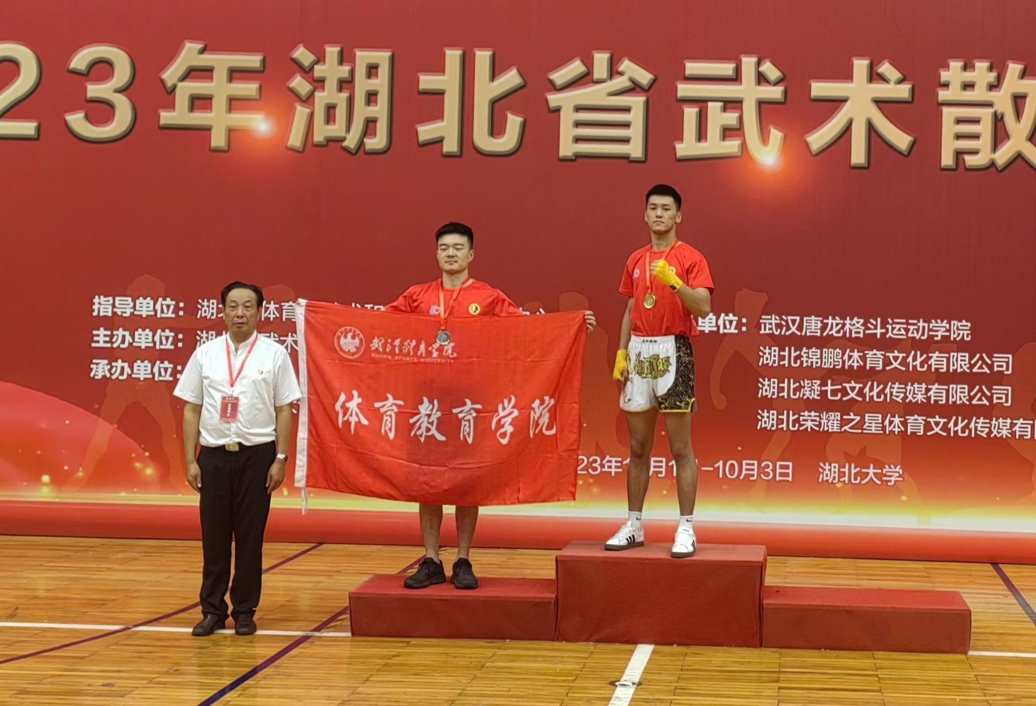 丹桂飘香庆佳节,红旗飘扬贺国庆。10月1日晚,当人们沉浸在节日喜悦之时,在湖北大学举行的湖北省武术散打搏击联赛赛场传来捷报:我校健康管理学院21级体育教育专业学生李维东不畏强手,拼智拼勇,凭借过硬的散打搏击技术和良好发挥,荣获70公斤级决赛金牌!
