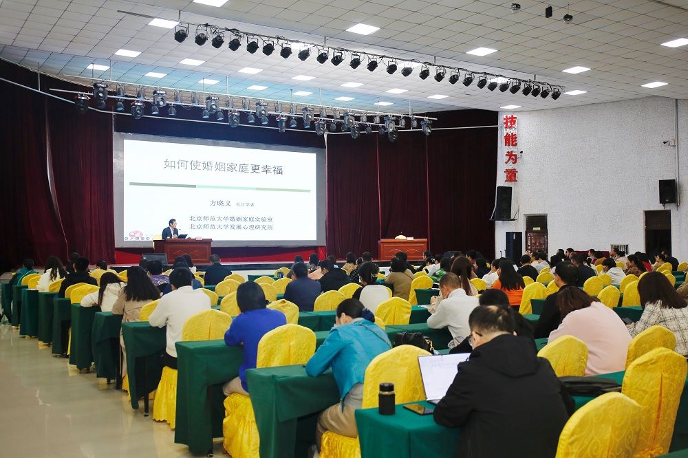 11月9日,教职工“幸福讲堂”第二期在大学生活动中心如期开讲,本次活动邀请到北京师范大学方晓义教授为我校教职工作题为“如何使婚姻家庭更幸福”的心理知识专题讲座。讲座由副校长曹树真主持,学工处、合作交流处、校工会女工委负责同志及教职工200余人参加了本次活动。