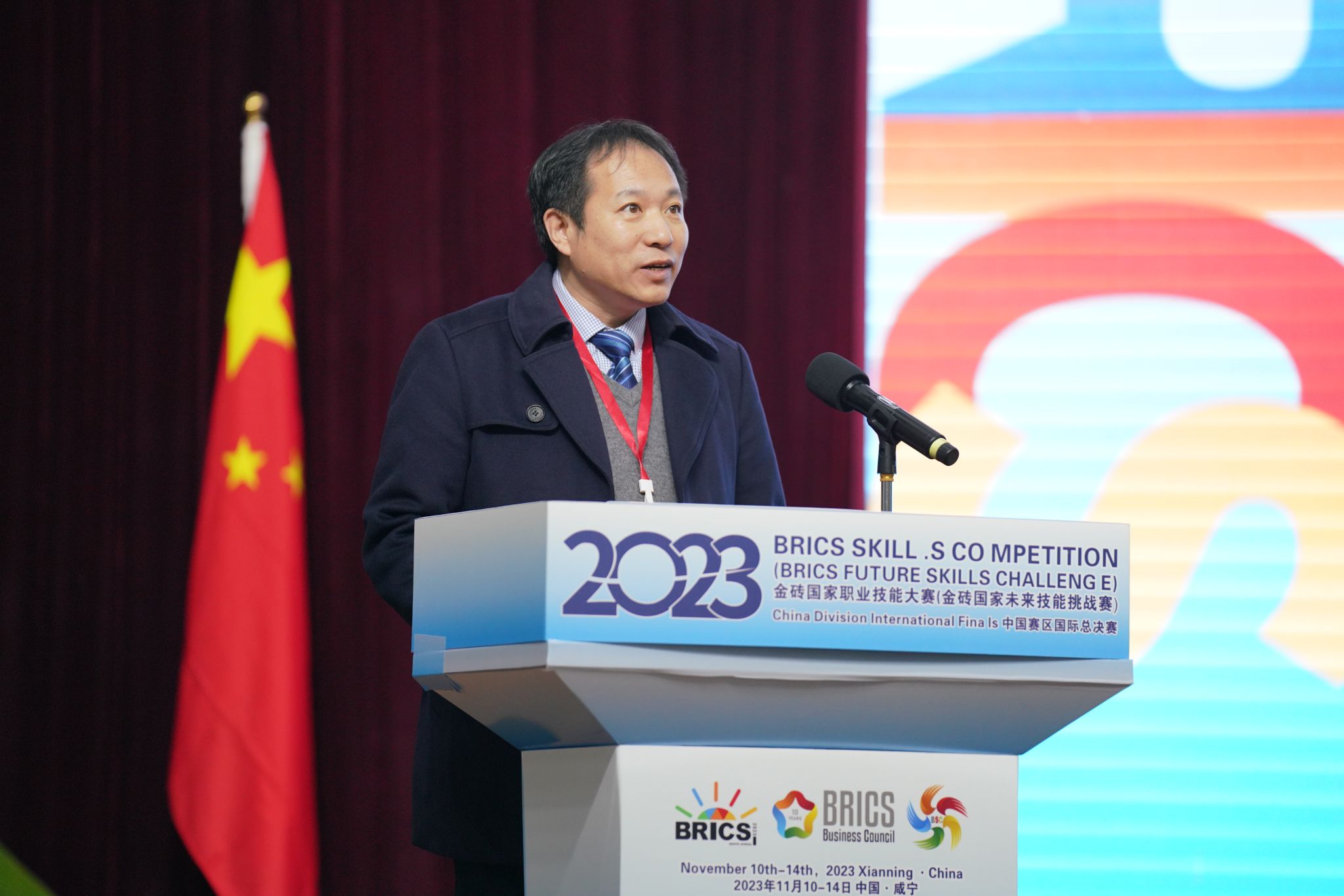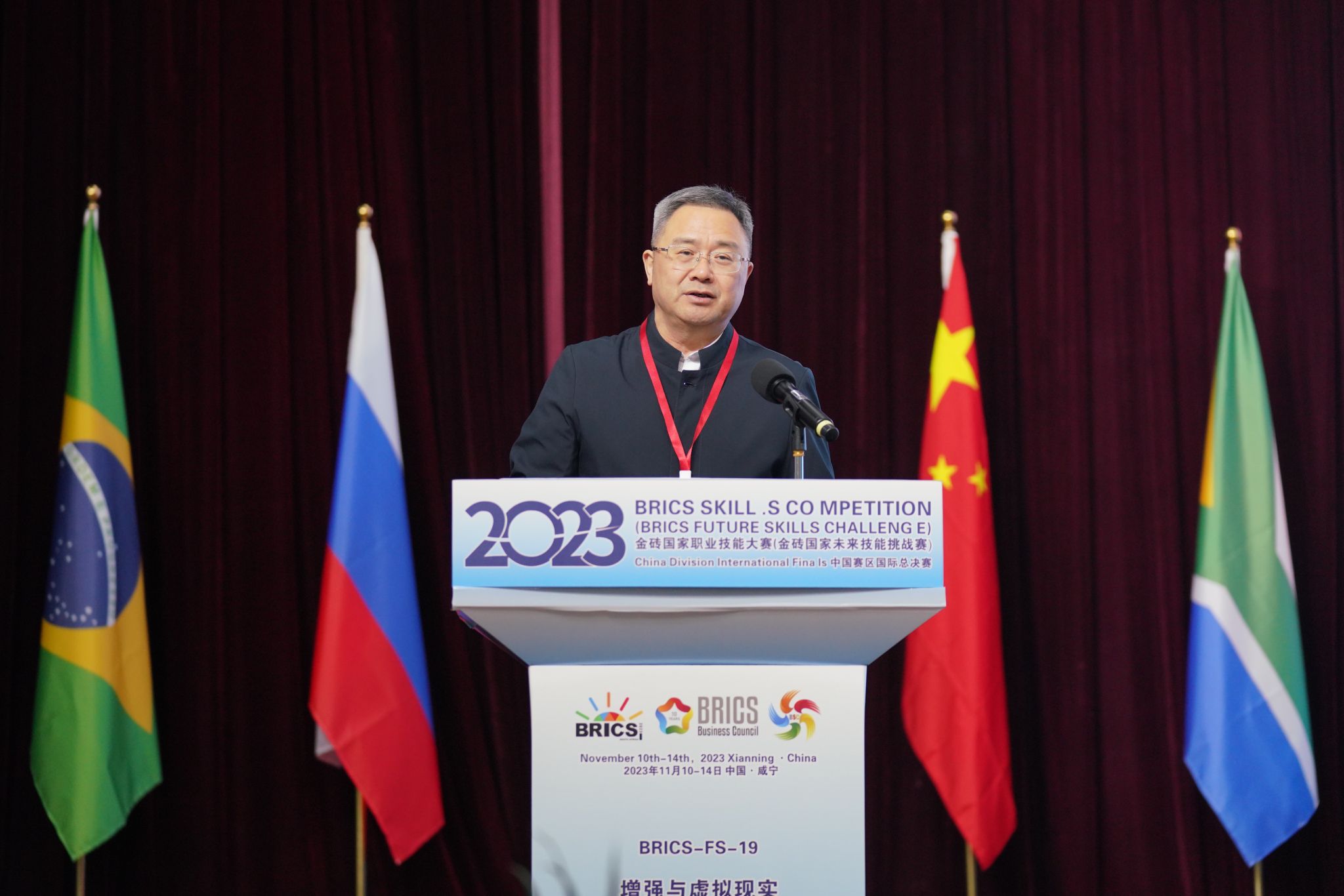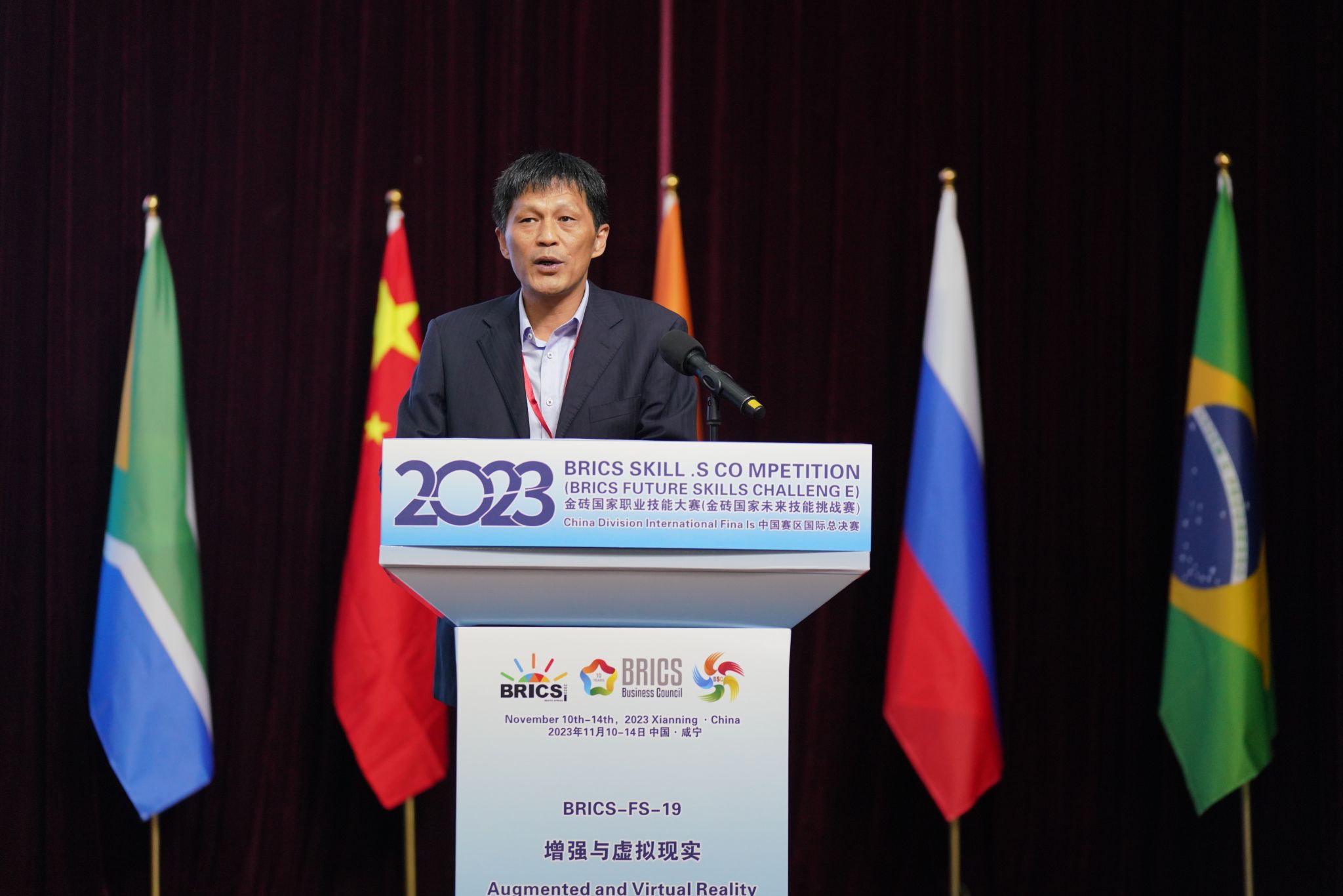 全贤发代表市委市政府致欢迎辞,他表示,2023金砖国家职业技能大赛“增强与虚拟现实”赛项中国赛区国际总决赛在咸举行,体现了金砖国家工商理事会(中方)技能发展工作组、一带一路暨金砖国家技能发展国际联盟、教育部中外人文交流中心对咸宁的关心和支持。作为中国赛区赛项承办单位,咸宁市将严格按照大赛执委会要求,全力以赴做好赛事各项工作,为大赛的顺利举行提供全方位服务和保障,致力于把本次大赛办成保障有力、规范有序、服务优质、安全精彩的高质量赛事。