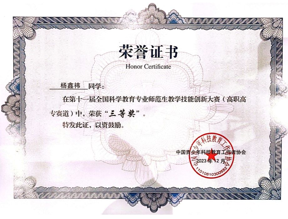 12月12日,以“培养未来卓越科学教师”为主题的“第十一届全国科学教育专业师范生教学技能创新大赛”在上饶幼儿高等师范专科学校落下帷幕。全国87所高校的942名选手同台竞技,我校21级小学科学教育专业学生杨鑫祎在比赛中脱颖而出,荣获该赛项“三等奖”。