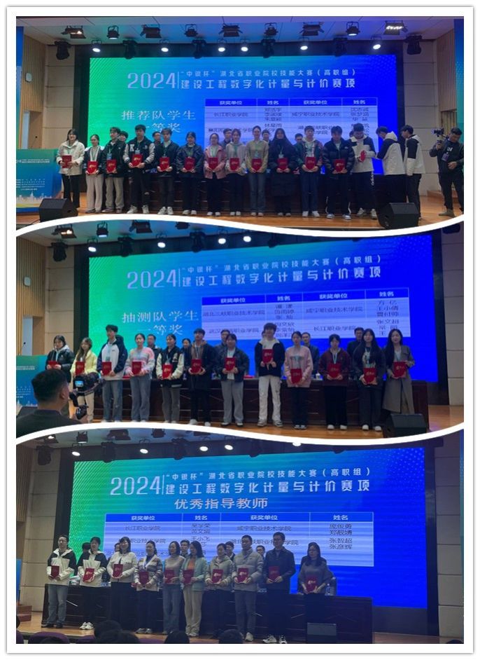2024年3月15日,在“建设工程数字化计量与计价”赛项中,我校建筑学院参赛教师与学生获得2项一等奖!其中教师个人赛庞俊勇、郑靓婧老师分别获得二等奖、三等奖,学生团体赛推荐队(沈志诚、华慧、张梦涵)荣获一等奖第4名、抽测队(方亿、王小倩、曹付帅)荣获一等奖第3名,庞俊勇、郑靓婧老师同时荣获优秀指导教师奖。