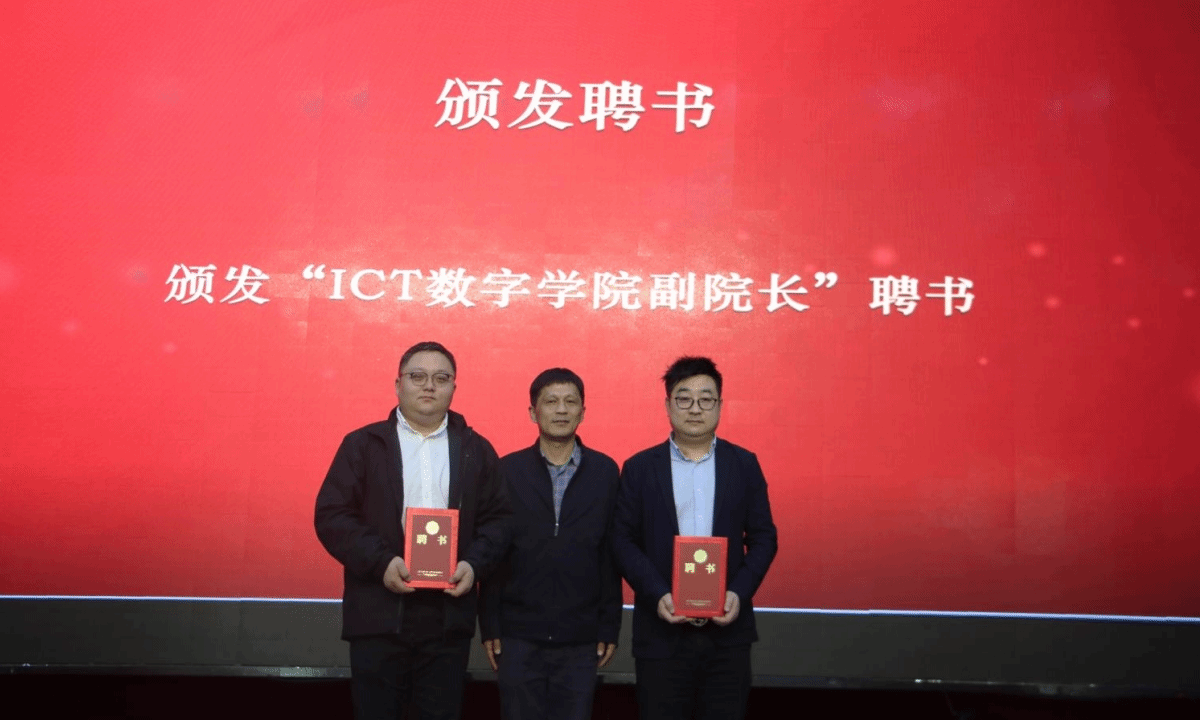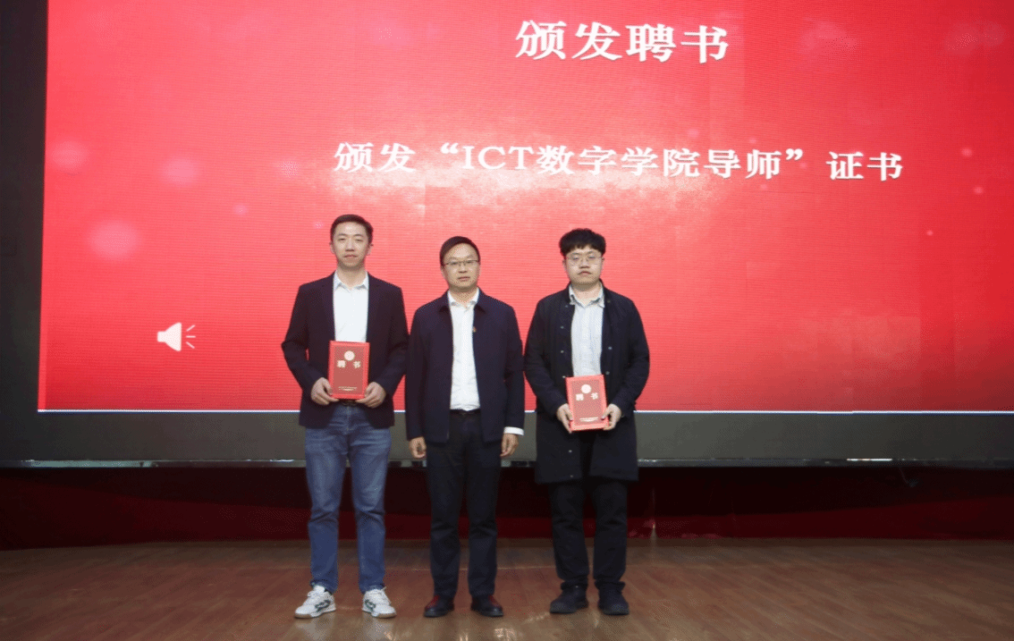 曹树真为周子恒、姜明哲颁发了“新华三ICT数字学院副院长”聘书,胡文杰为吴少博、唐凯颁发了“新华三ICT数字学院导师”聘书。