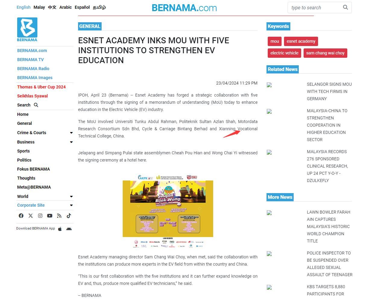 4月23日,校长陈红卫率队赴马来西亚进行电动汽车课程普及化合作交流,并与ESnet Academy学院签署合作备忘录,被马来西亚国家新闻社、马来西亚中国报等媒体大篇幅报道。