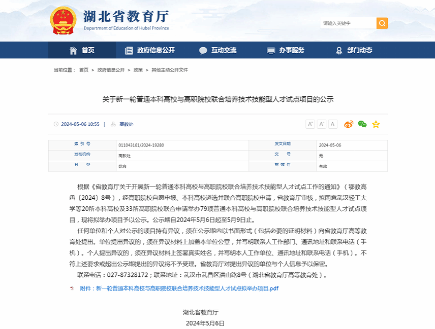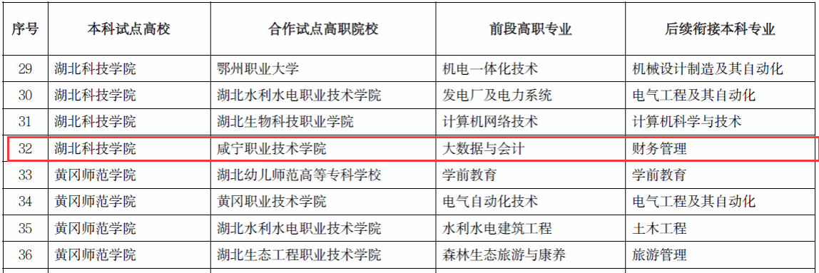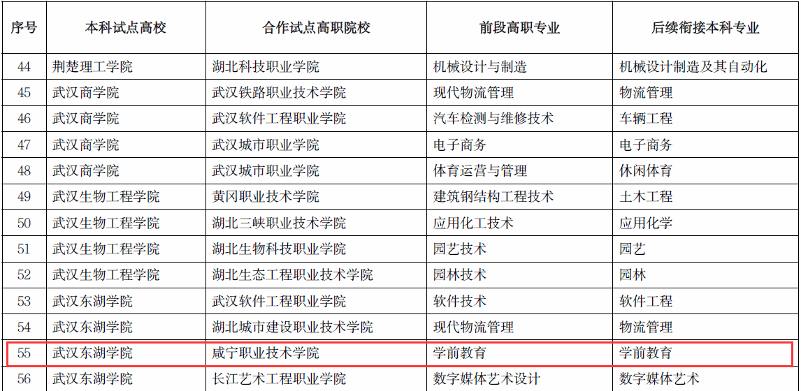 近日,湖北省教育厅发布《关于新一轮普通本科高校与高职院校联合培养技术技能型人才试点项目的公示》,我校大数据与会计专业、学前教育专业、机电一体专业,分别与湖北科技学院、武汉东湖学院、武昌首义学院3所本科院校开展技术技能型人才培养试点。