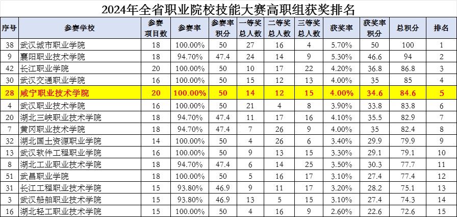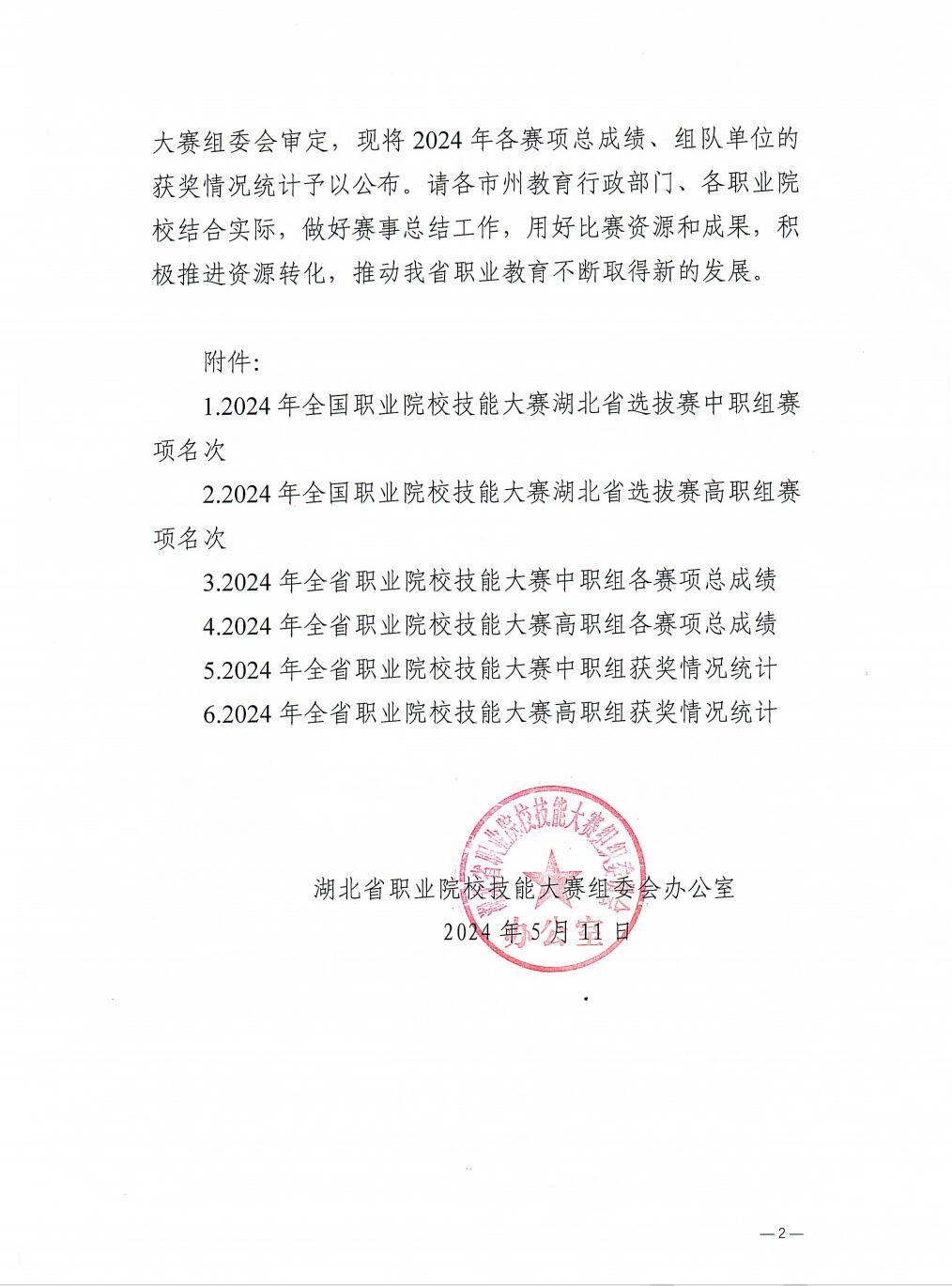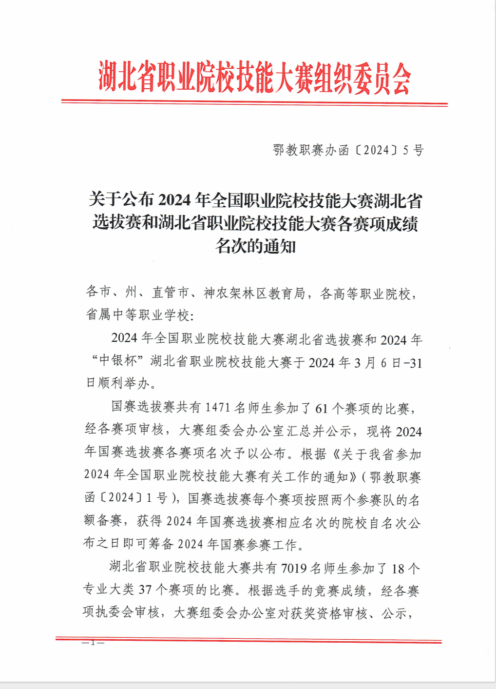 近日,省教育厅公布了《省教育厅关于公布2024年“中银杯”湖北省职业院校技能大赛获奖名单的通知》《关于公布2024年全国职业院校技能大赛湖北省选拔赛和湖北省职业院校技能大赛各赛项成绩名次的通知》,2024年全省职业院校技能大赛共63所高职院校参赛,我校综合成绩名列全省第5。